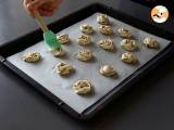 Coloca las caracolas sobre una bandeja de horno en la que habremos puesto papel de hornear. Pintar con clara de huevo y añadir por encima un poco de galleta desmenuzada.