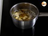Calentar el agua en una cacerola a fuego medio. Agregar: el azúcar moreno + azúcar blanca + mantequilla. Deja hasta que hierva y que la mantequilla se funda completamente.