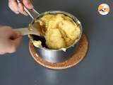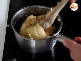 Apartar la cacerola del fuego y añadir toda la harina de una vez. Mezclar bien con una cuchara de madera y volver a poner el cazo al fuego. Sigue mezclando hasta que la masa se despegue de las paredes.