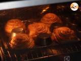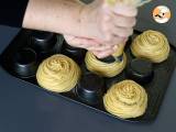 Dar la vuelta al molde para magdalenas y engrasar toda la superficie. A continuación, coger la manga pastelera e ir cubriendo los cubiletes siguiendo la forma de estos, haciendo como si fuera una espiral continua. Es importante que no queden huecos entre las partes, así que presiona con los dedos si fuera necesario aquellas partes que no se hayan quedado bien pegadas. Aplana también la parte superior (ya que luego será la base de nuestra cesta). Vuelve a engrasar las cestitas para churros.