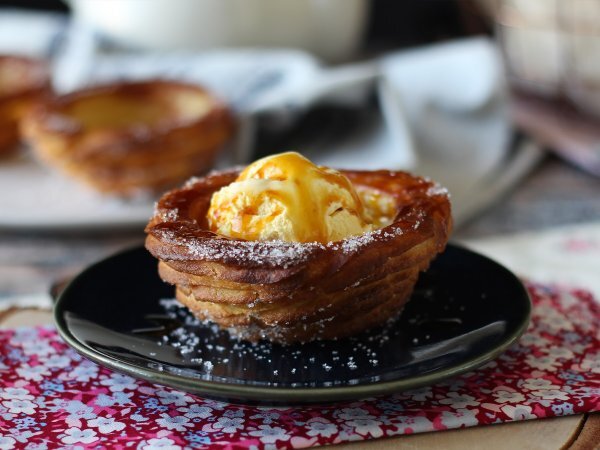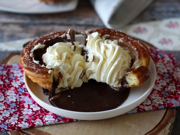 En España, los churros se suelen disfrutar junto a una taza de chocolate caliente. Por eso, para emular el sabor, hemos rellenado nuestros churros en forma de bol de una ganache de chocolate casera. Es muy fácil. Calienta la nata y funde en ella el chocolate troceado (en la misma cantidad que de nata). Si quieres que tu chocolate se solidifique en tus cuencos, simplemente mételos en la nevera.