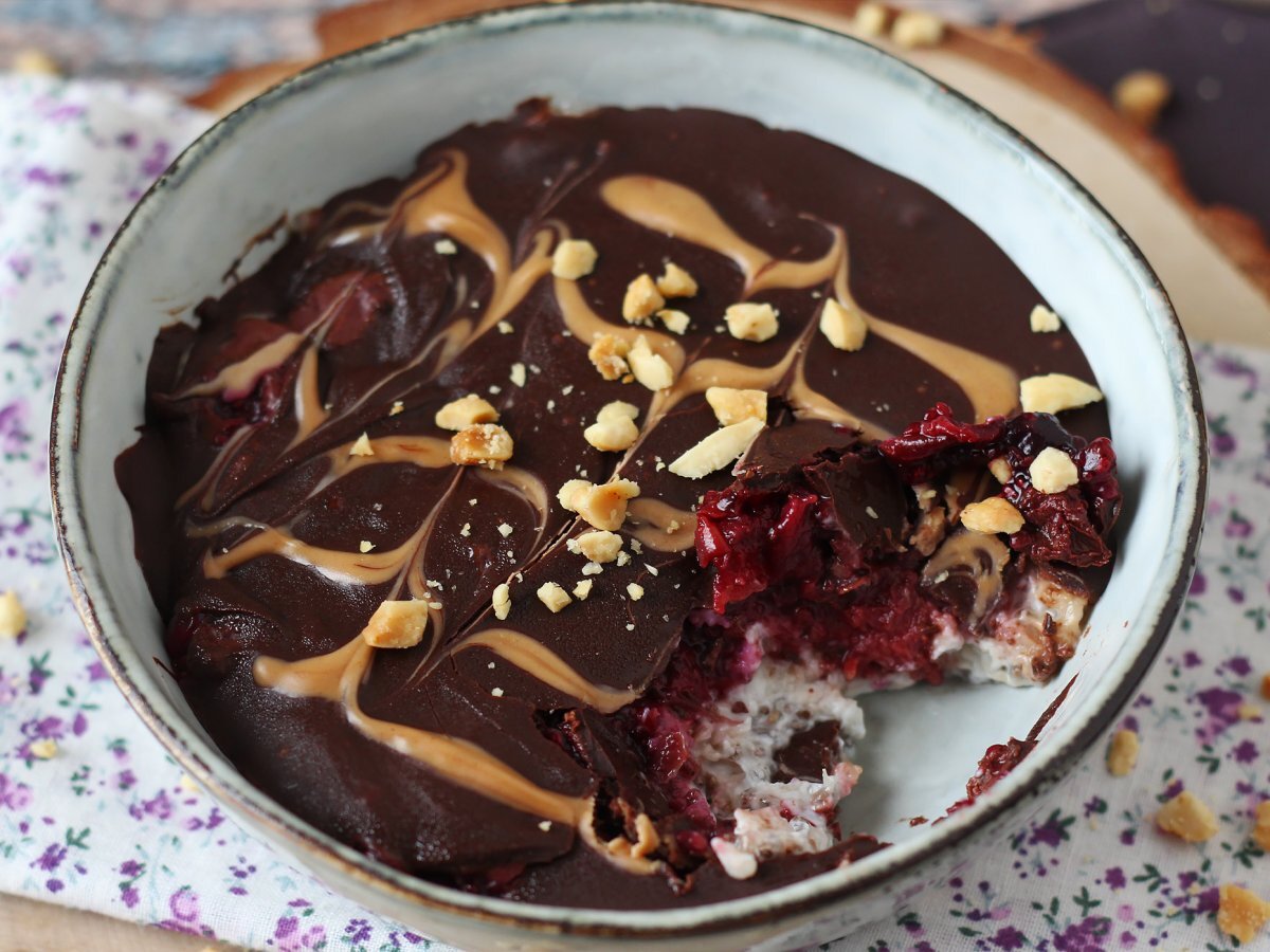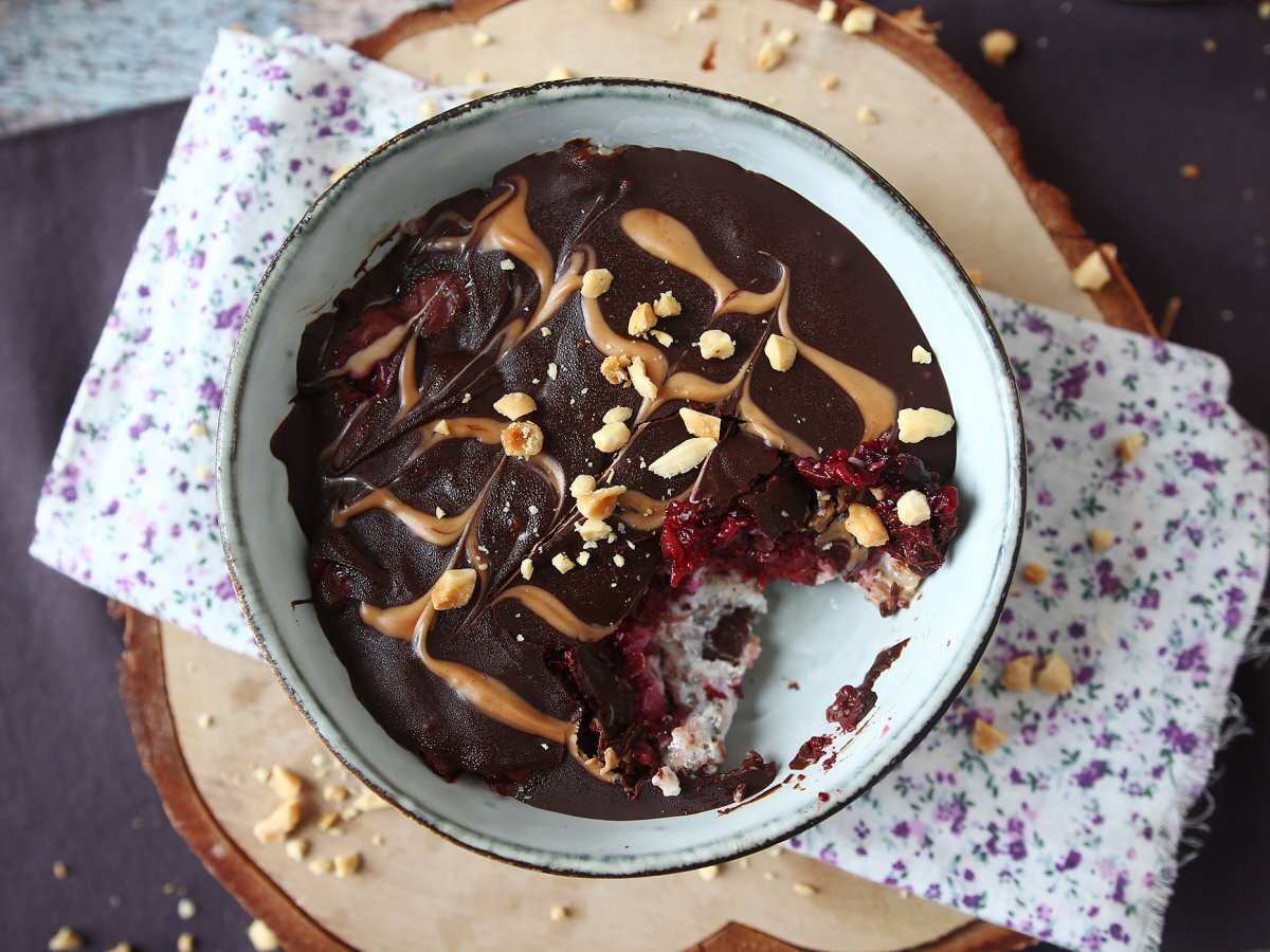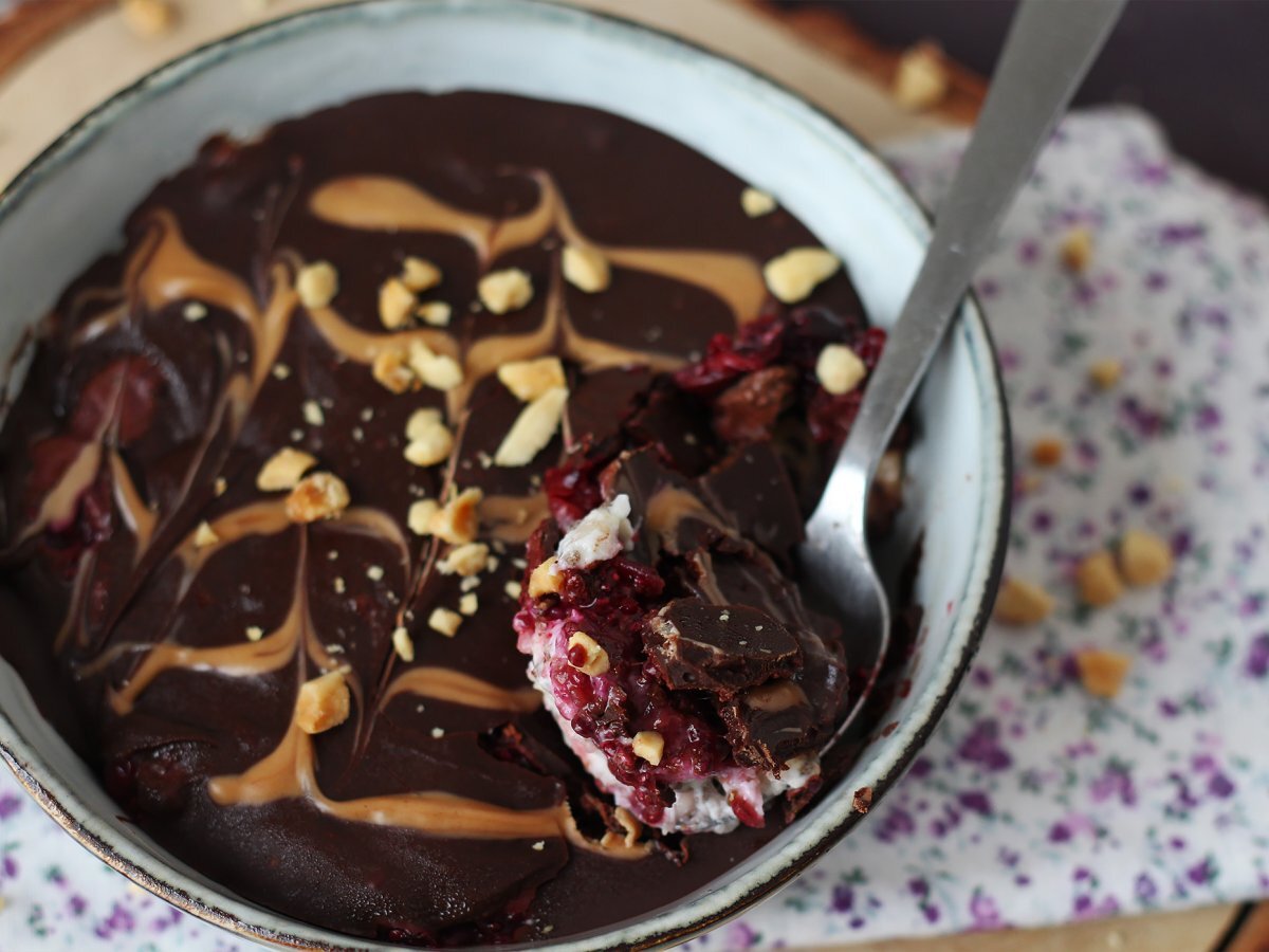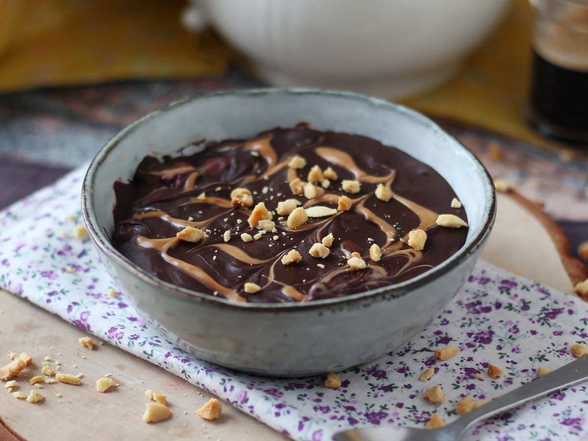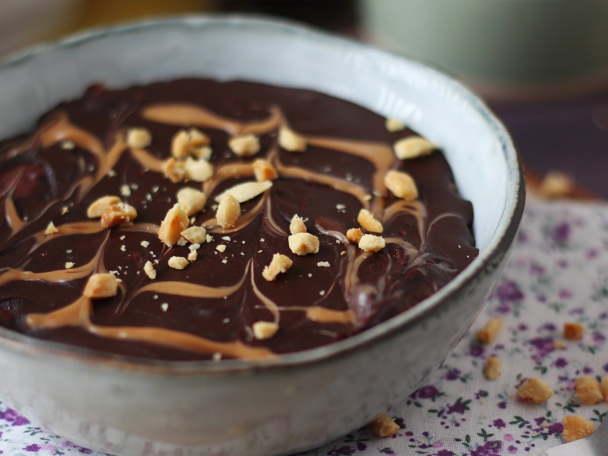 Añadir tus toppings preferidos (nosotros hemos utilizado crema de cacahuete). Dejar en la nevera al menos dos horas antes de servir, pero recomendamos dejarlo reposar toda la noche.