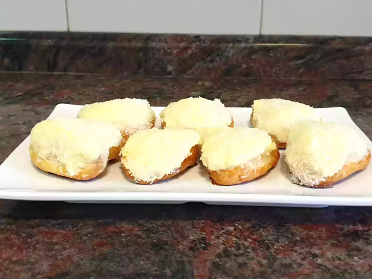 Por último, ponemos un poco de coco rallado en un plato y vamos untando las palmeritas por el lado de la mantequilla por el coco rallado para que se impregne sobre las palmeritas.