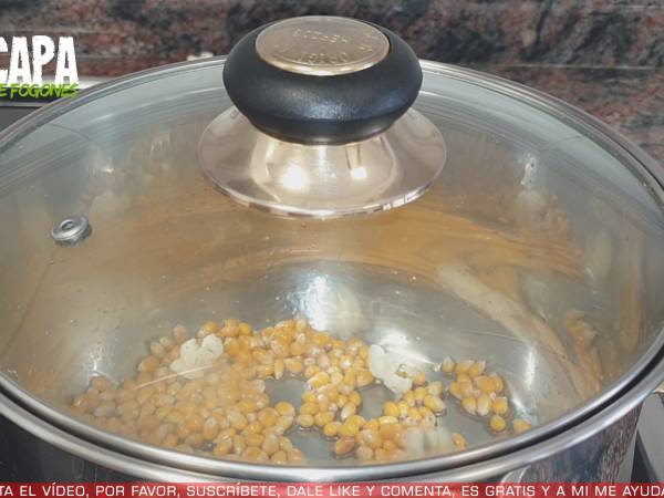 Lo primero que haremos será las palomitas, para ello, en una cazuela grande calentamos un chorrito de aceite, yo voy a usar un aceite de girasol para que no le aporte demasiado sabor a las palomitas. Cuando el aceite ha cogido temperatura añadimos los granos de maíz le ponemos la tapa a la cazuela y dejamos que se hagan las palomitas. Si queréis también podéis hacer las palomitas en el microondas.