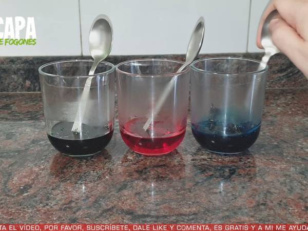 Ahora repartimos el almibar en 3 vasos con la misma cantidad más o menos y a cada vaso le vamos a poner un poco de colorante alimentario de distintos colores. Yo voy a utilizar los colores verde, rojo y azul. Vosotros utilizar los colores que más os gusten.