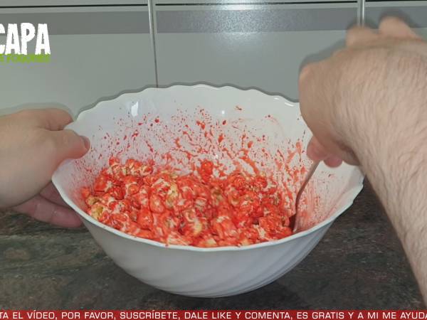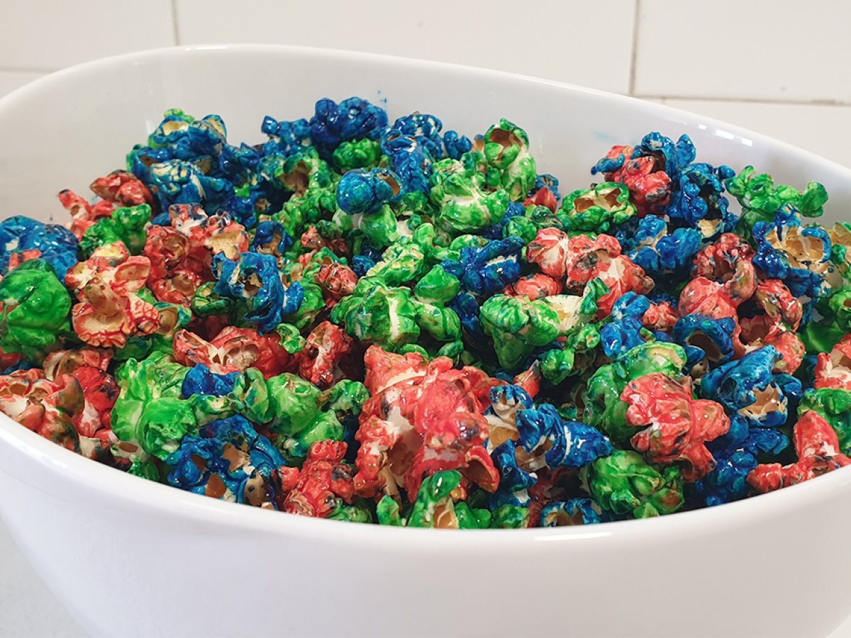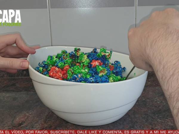 Ahora añadimos más o menos un tercio de las palomitas en un bol amplio y añadimos el almibar con el colorante, en mi caso de color rojo y procedemos a remover las palomitas para que se impregnen bien del almibar rojo. Ahora volvemos a añadir una cantidad de palomitas a un bol amplio y repetimos la misma operación, pero con otro color, en este caso verde. Y por último terminamos con el último color que en mi caso es el azul.