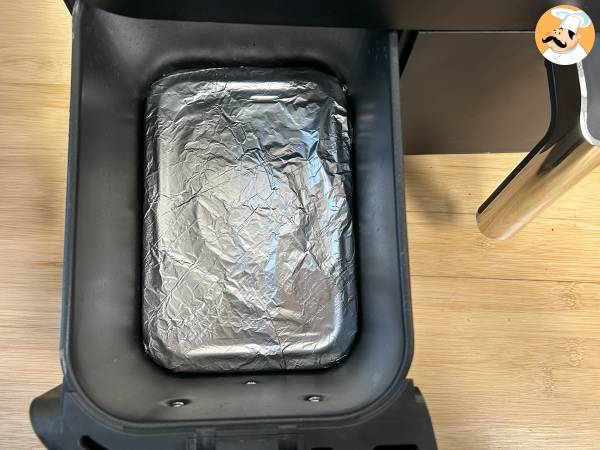Cubrir la rejilla (de la cesta) de la freidora de aire con 1 hoja de papel de aluminio.