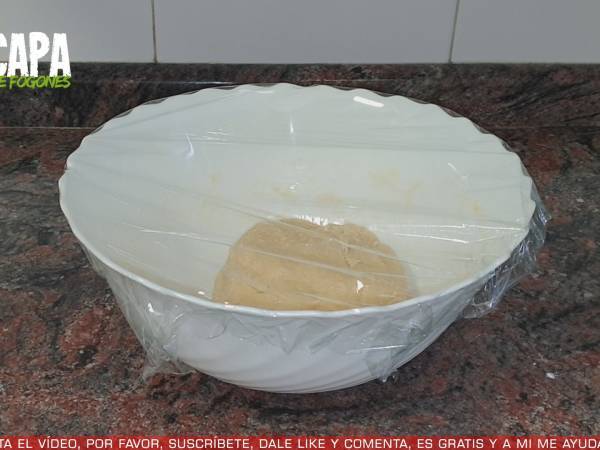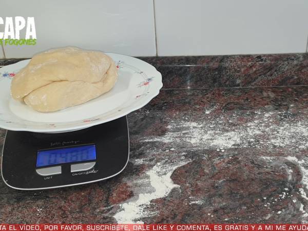 Ahora le quitamos el aire a la masa, la cubrimos con papel film y volvemos a dejar en reposo hasta que doble su volumen. Después, añadimos un poco de harina a la superficie de trabajo, colocamos la masa y amasamos un minuto para quitar el aire a la masa. Pesamos la masa y la dividimos en 8 partes iguales.