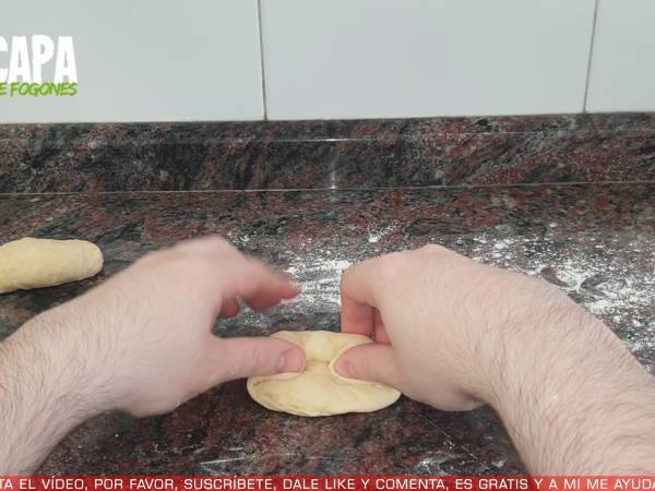 Ahora cogemos una parte de la masa, hacemos una bola y después la aplanamos con los dedos, después vamos enrollando la masa sobre sí misma y metiendo los extremos hacia dentro, dándole forma de panecillo. Vamos a hacer otro para que os quede claro. Primero aplanamos con los dedos, ahora vamos enrollando la masa sobre sí misma y vamos metiendo los extremos hacia dentro, le damos forma de panecillo y ya está. Hay que procurar que todos tengan el mismo tamaño. Colocamos los panecillos en una bandeja de horno, los cubrimos con papel film y dejamos que reposen hasta doblar su volumen.