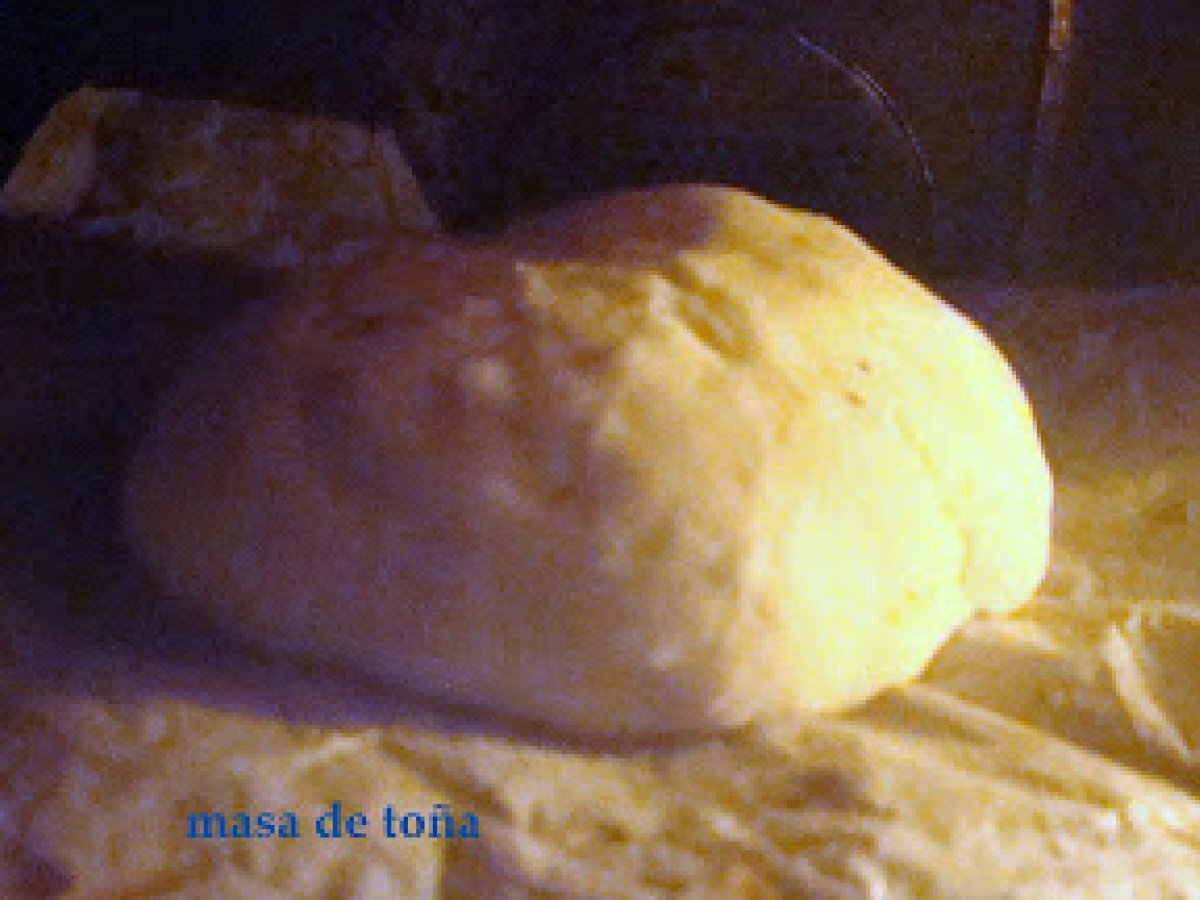 - Ponemos harina en la mesa de trabajo encima ponemos la masa, si se pega es normal. Amasamos un poco para sacar el aire y dividimos en tres partes la masa. Las pondremos sobre papel de horno, el mismo papel con el que la meteremos las toñas en el horno, las hornearemos de una en una porque crecen mucho.