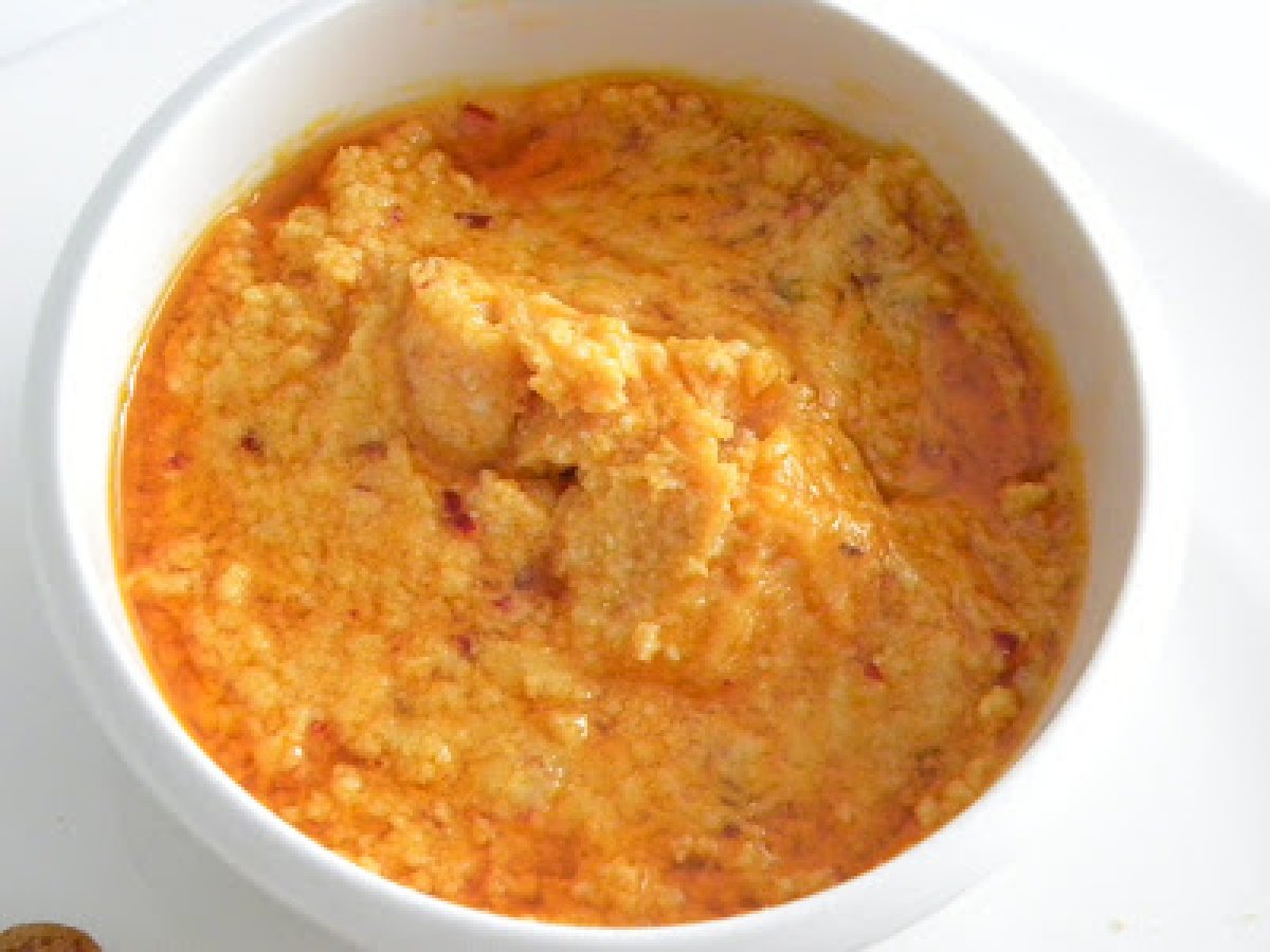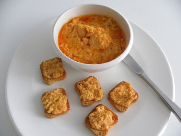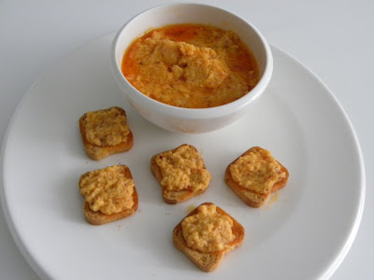 - Rallar el queso duro. Poner el queso rallado en un recipiente apto para usar en la batidora, añadir los dientes de ajo pelados, la pimienta palmera o ñora cortada fina, los tomates, y la pimienta picona o pimentón picante y un chorro de aceite. Ponemos a funcionar la batidora y añadir aceite poco a poco hasta lograr una consistencia de paté.