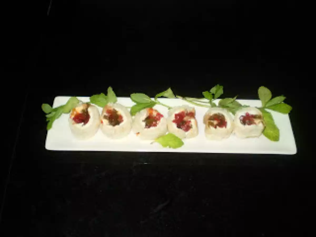 - Deje enfriarse un poco. El apestados y nivelados trance de pan con un rodillo, grasas el pan con una buena capa de queso y pone en cumbre los pimentos. Envuelva con papel a horno.
