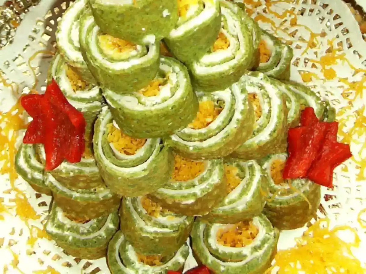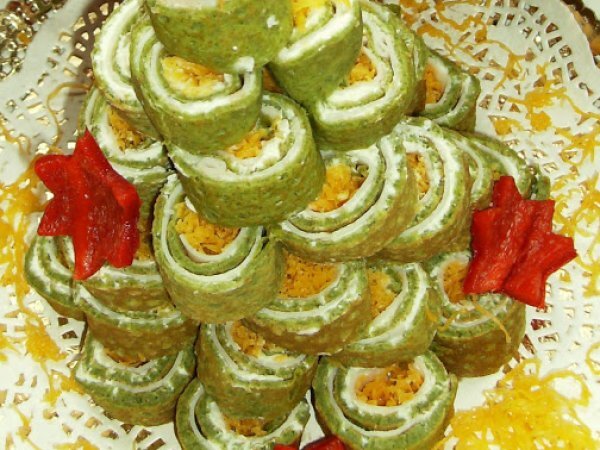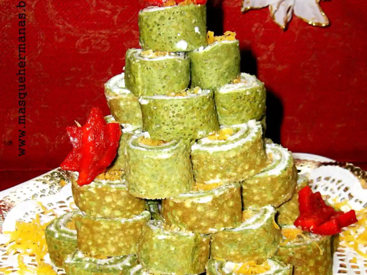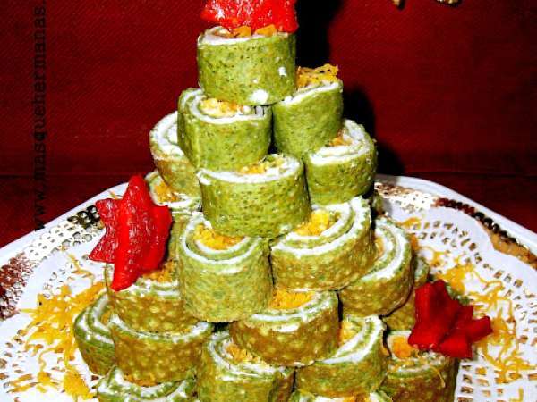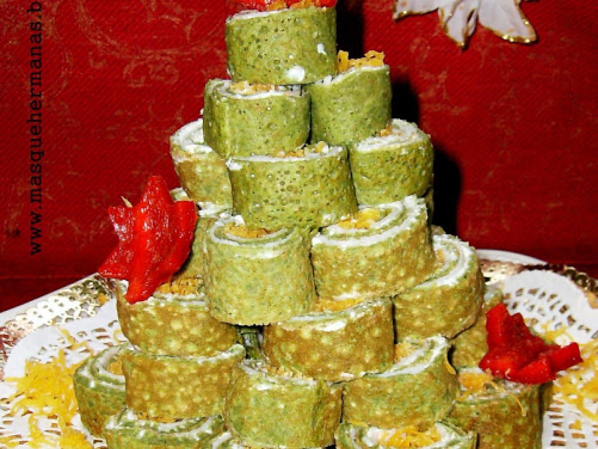 Árbol navideño de crepes y huevo hilado AnteriorSiguiente OtroFácil45 min472 Kcal Enviar esta receta a un amigo Imprimir esta página Preguntar al autor Publicar la foto de esta receta Ingredientes 6 300 g de harina 6 huevos 1/4 l de leche Mantequilla 100 g de espinacas congeladas nuez moscada sal y pimienta 2 tarrinas de queso en crema 200 g de huevo hilado Santa Teresa 200 g de jamón cocido 1 pimiento rojo pequeño Costo estimado: 7.43Euros€ (1.24€/porción)