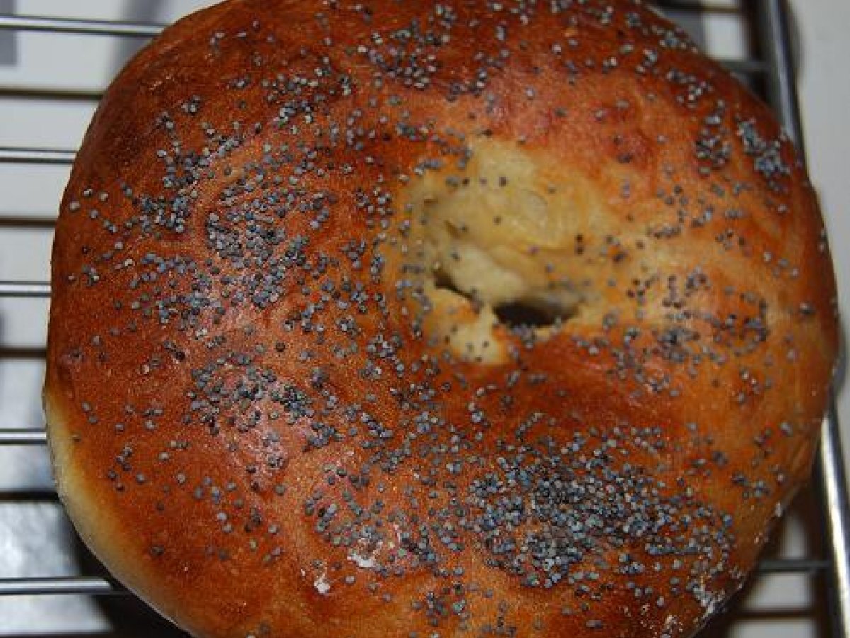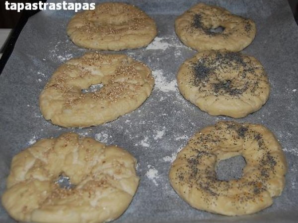 - En una olla grande hacemos hervir agua con una cucharada de azúcar moreno. Cuando hierve el agua, bajamos el fuego al mínimo y cocemos los bagels medio minuto por cada cara. Los escurrimos y los secamos con servilletas de papel y las colocamos en la misma placa de horno con el papel de horno enharinado.