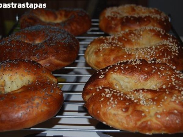 - A continuación damos forma de 'donuts' a las bolas de masa. La forma más fácil es hundir el pulgar en el centro y dejando un dedo en el agujero hacemos que giren una y otra vez hasta que el agujero central se vaya haciendo más grande, aproximadamente unos 2 centímetros. El vídeo que Mercè localizó en Youtube puede ser más clarificador de la técnica que se utiliza para darle esta forma tan característica a los bagels. Los dejamos reposar unos 20 minutos.