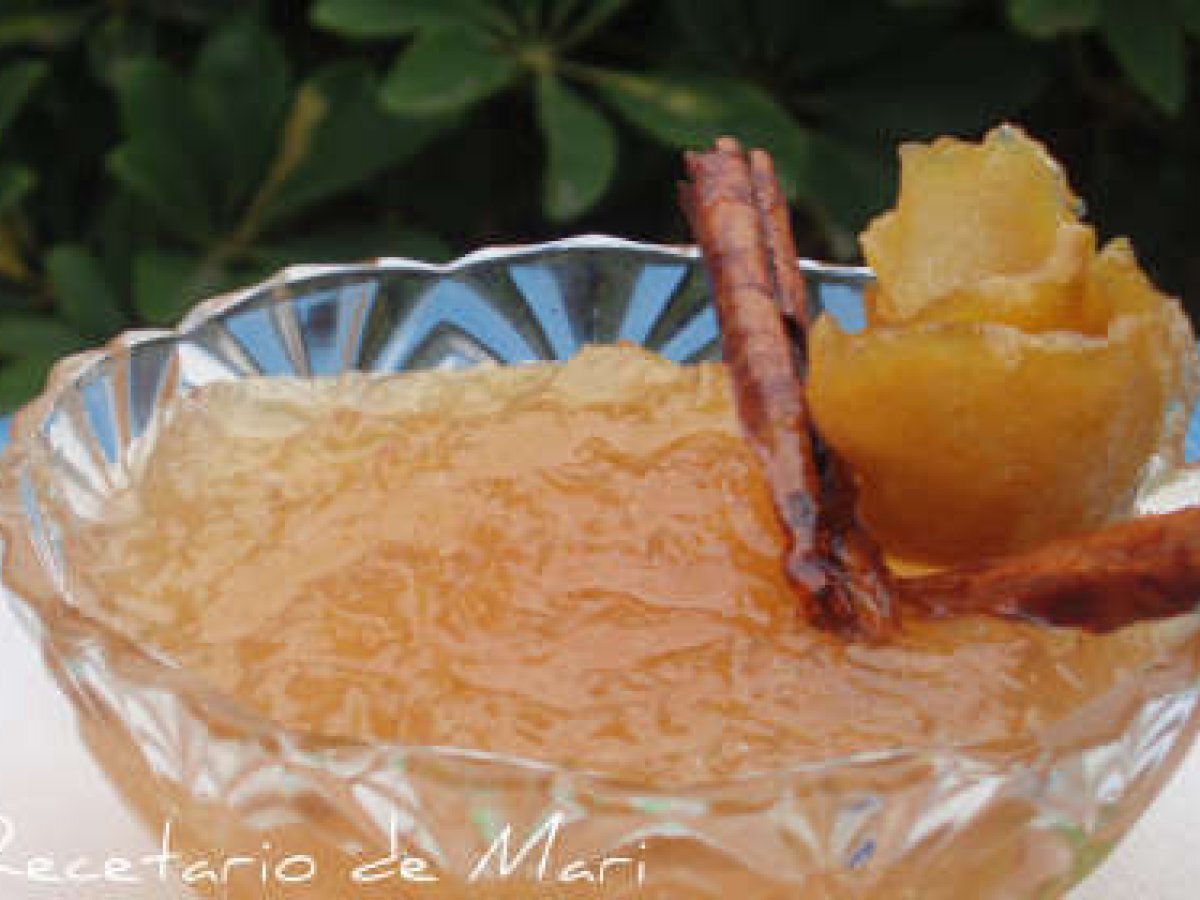 4. Pesamos todo el conjunto y le incorporamos el mismo peso en azúcar. Lo disponemos en un cazo, le añadimos la canela, la corteza de un limón y el jugo del limón. Bajamos el fuego y vamos removiendo de vez en cuando, con una cuchara de madera, hasta que vaya adquiriendo un color dorado (aproximadamente 1h y media)