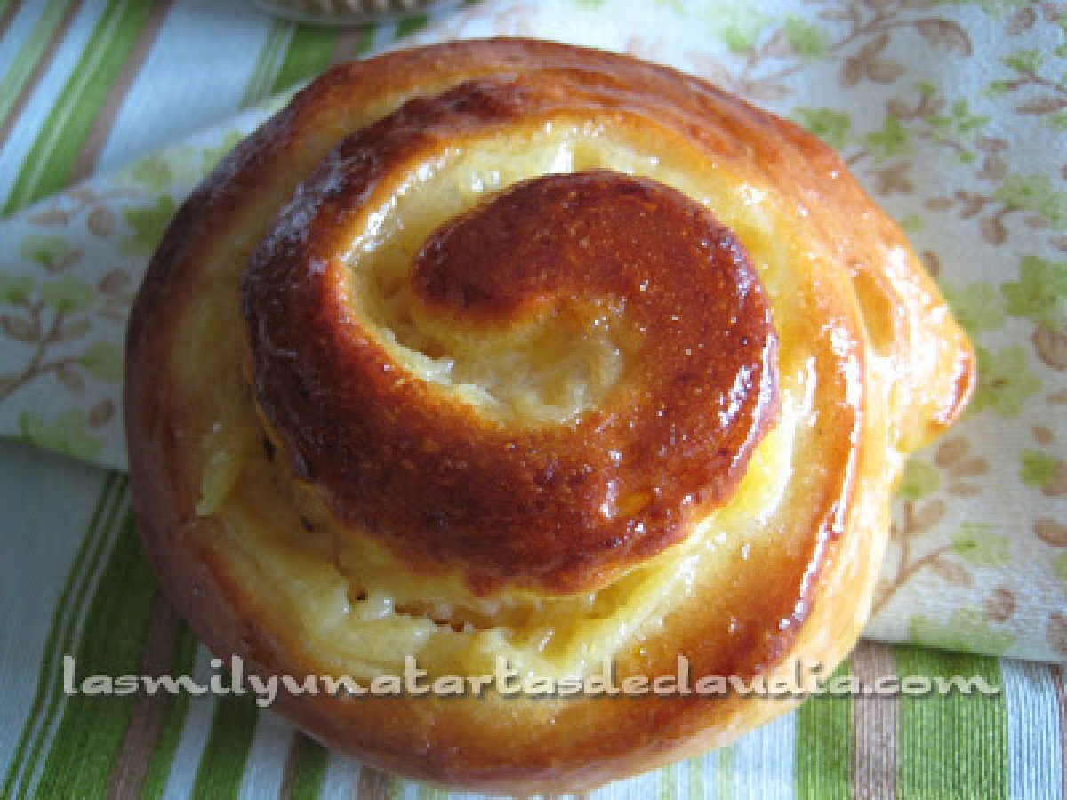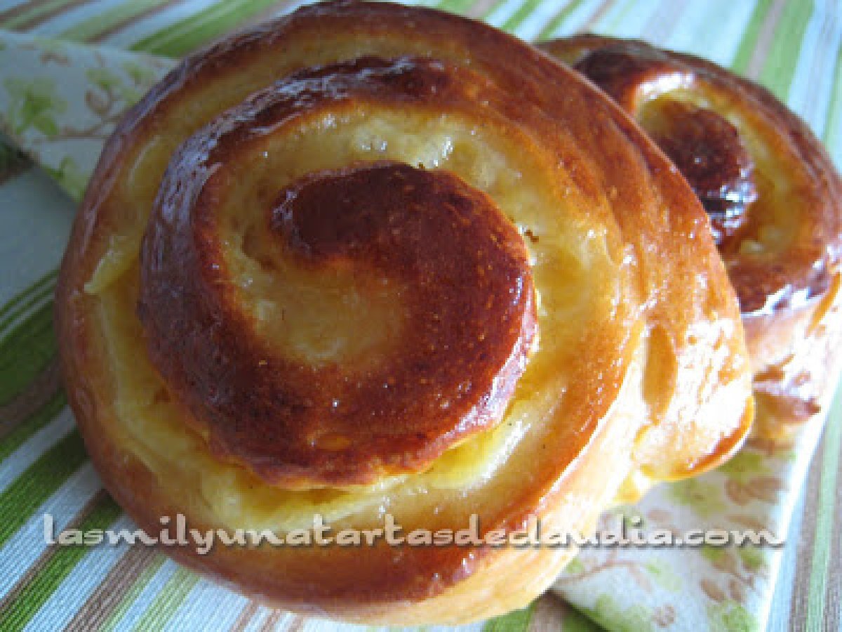 Caracolas de crema y buttermilk AnteriorSiguiente OtroFácil50 min Enviar esta receta a un amigo Imprimir esta página Preguntar al autor Publicar la foto de esta receta Ingredientes 2 Masa: 270 g de harina de fuerza 10 g de levadura fresca 30 g de azúcar 1 cucharada de azúcar invertido 1/2 cdita. de extracto de malta 65 ml de leche entera tibia 65 ml de buttermilk 25 g de mantequilla en pomada 1 huevo 1 pizca de sal Ralladura de naranja Almíbar para glasear 100 g de azúcar 150 g de agua 1/2 vaina de vainilla Crema: 250 cc. de leche entera 60 g de azúcar 2 yemas de huevo 20 g de Maicena Un trocito de mantequilla Esencia de vainilla Doradura: 1 huevo Una pizca e sal Una cucharada de agua
