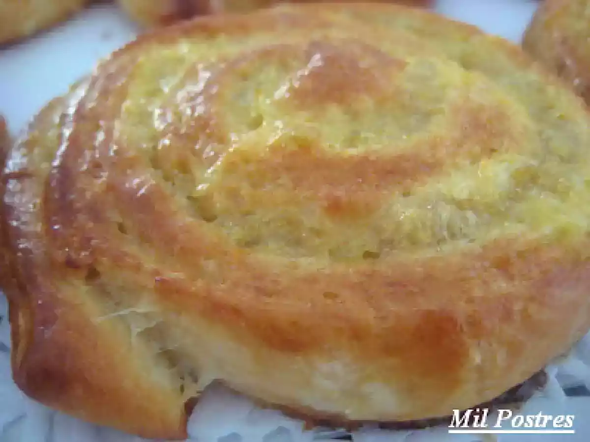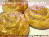 - Para hacer las caracolas, extender la masa sobre una superficie enharinada, de forma que quede de 1/2 cm. de grososr, más o menos. Colocar en toda la supeficie el cabello de ángel, bien dustribuido y con cuidado enrollar, aprentando un poco, envolver el rollo en papel film y dejar reposar 10 minutos en el congelador.