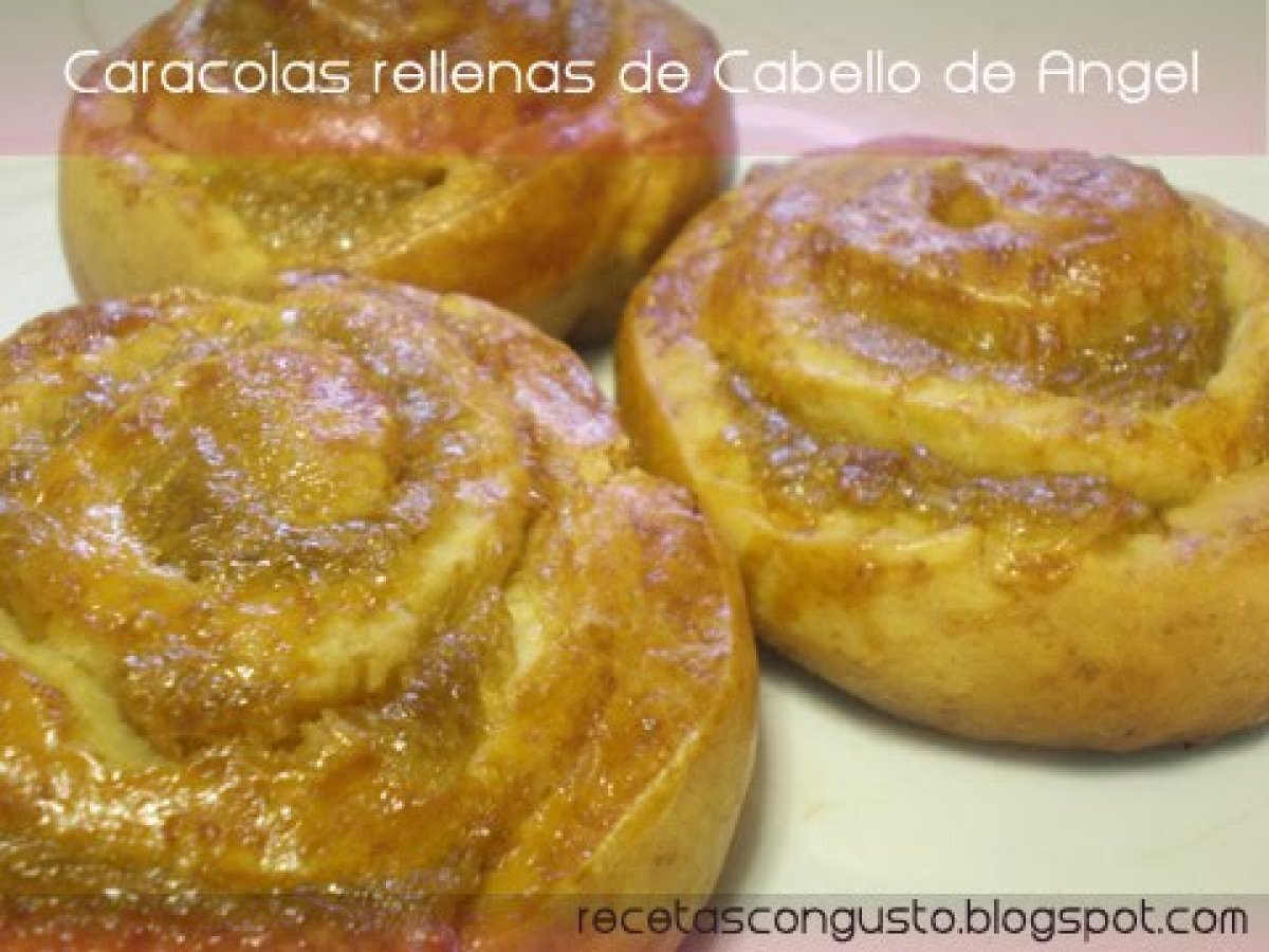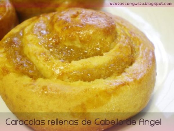 Añadir las yemas y seguir mezclando. Agregar la harina y la levadura y amasar. - Estirar la masa formando un rectángulo, pintarlo con mantequilla fundida, añadir el relleno de cabello de Ángel y enrollar.