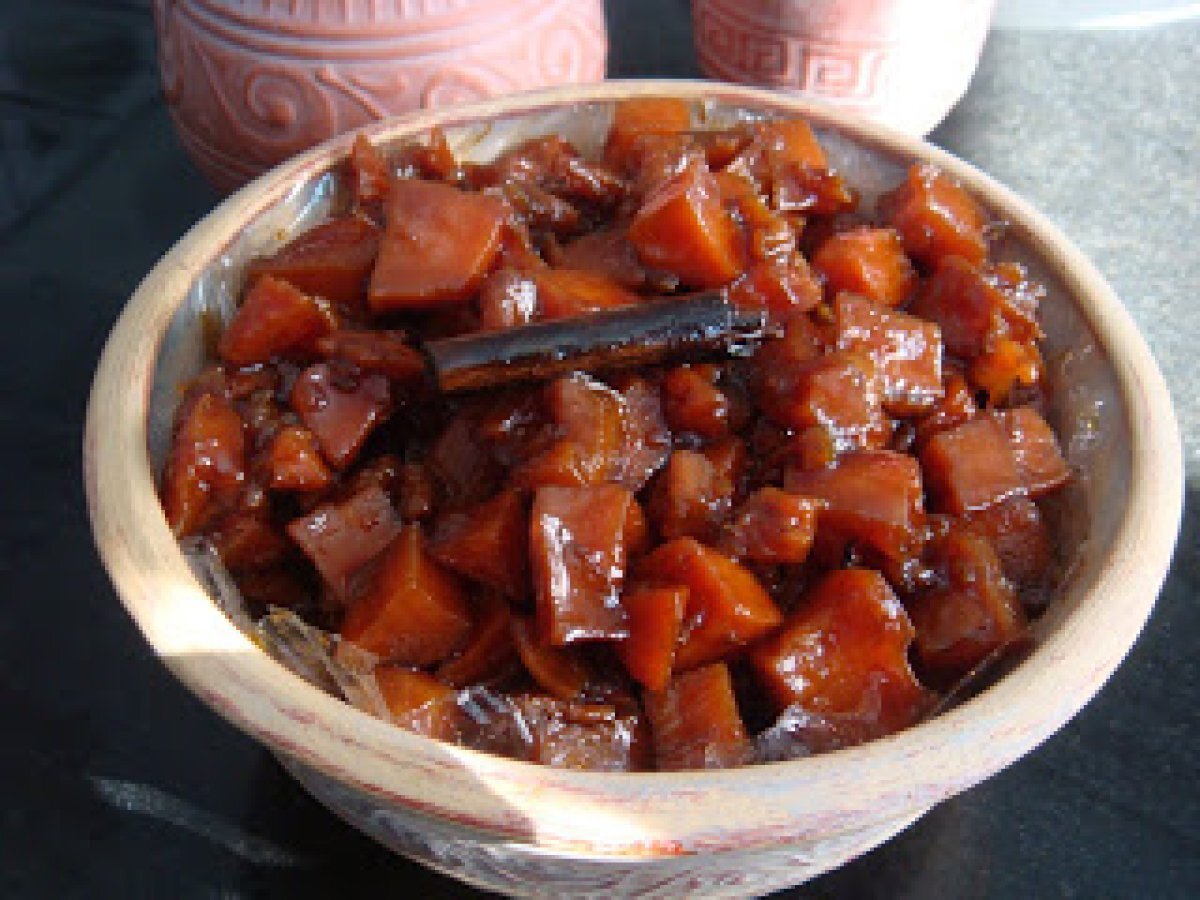 Compota de batata con miel AnteriorSiguiente OtroFácil30 min Enviar esta receta a un amigo Imprimir esta página Preguntar al autor Publicar la foto de esta receta Intentar preparar este nuevo ingreso interesante. Ingredientes 2 2 Boniatos 6 cucharadas de Miel de Caña 1 ramita de Canela 1 vaso de Agua 1 corteza de Limón Matalahuva (Anís Verde) 1 Clavo