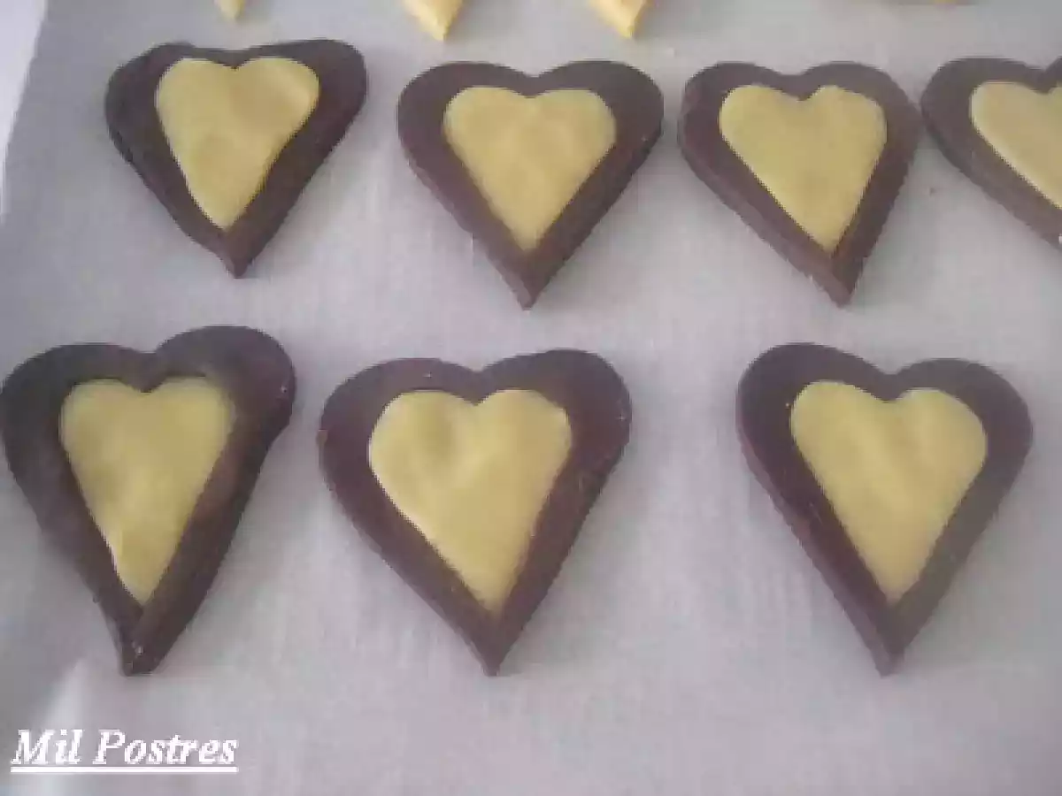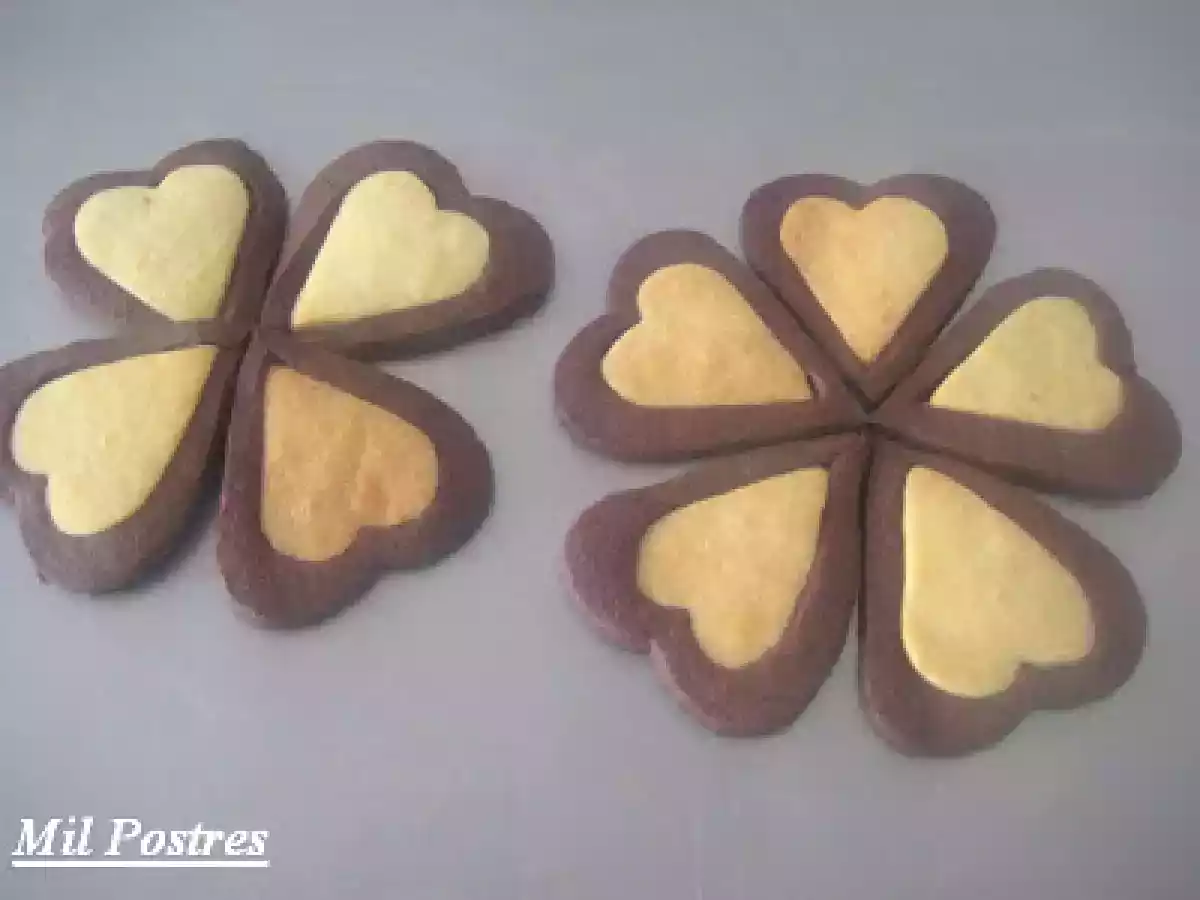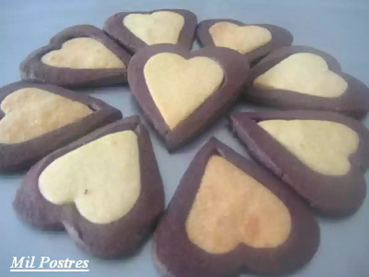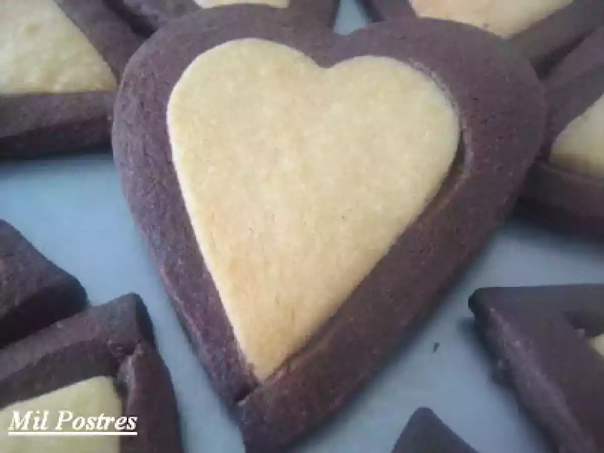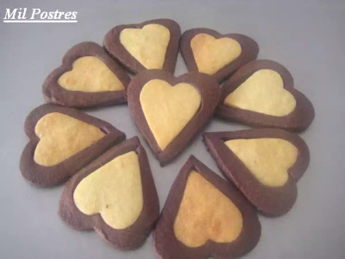 Corazones de vainilla y chocolate AnteriorSiguiente OtroFácil50 min6749 Kcal Enviar esta receta a un amigo Imprimir esta página Preguntar al autor Publicar la foto de esta receta Unas galletas sencillas pero realmente deliciosas. Ingredientes 1 350 gr de harina 200 gr de mantequilla (a punto de pomada) 150 gr de azúcar 1 huevo aroma de vainilla (1 cucharada) 300 gr de harina 50 gr de cacao en polvo (de buena calidad) 200 gr de mantequilla (a punto de pomada) 150 g de azúcar 1 huevo