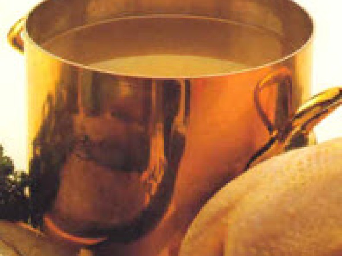 - Cuando rompa el hervor, agregar las verduras cortadas en mirepoix, la pimienta en grano y el desglasado de la bandeja. Dejar reducir a fuego suave durante 3 hs. Retirar luego del fuego dejando reposar durante 30 min. y finalmente colar a través de un lienzo.