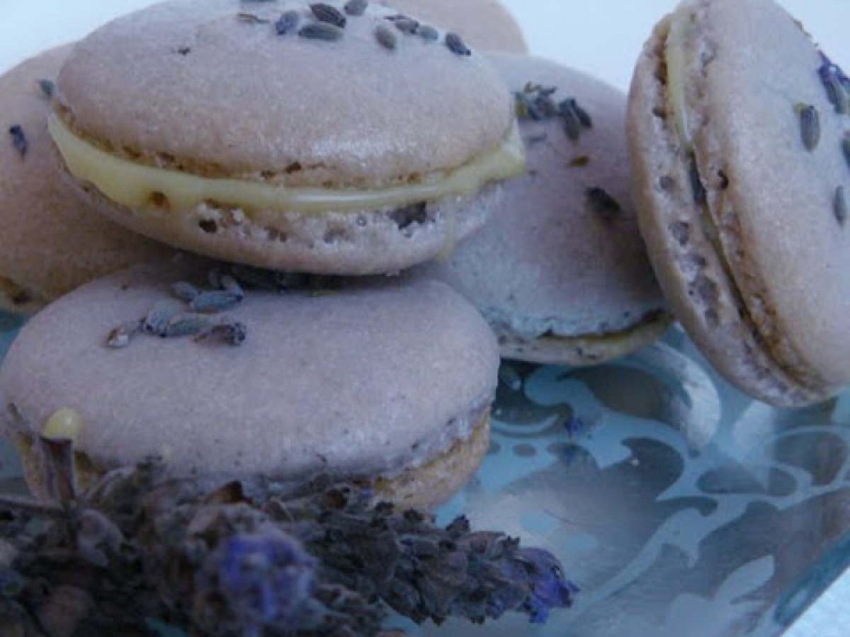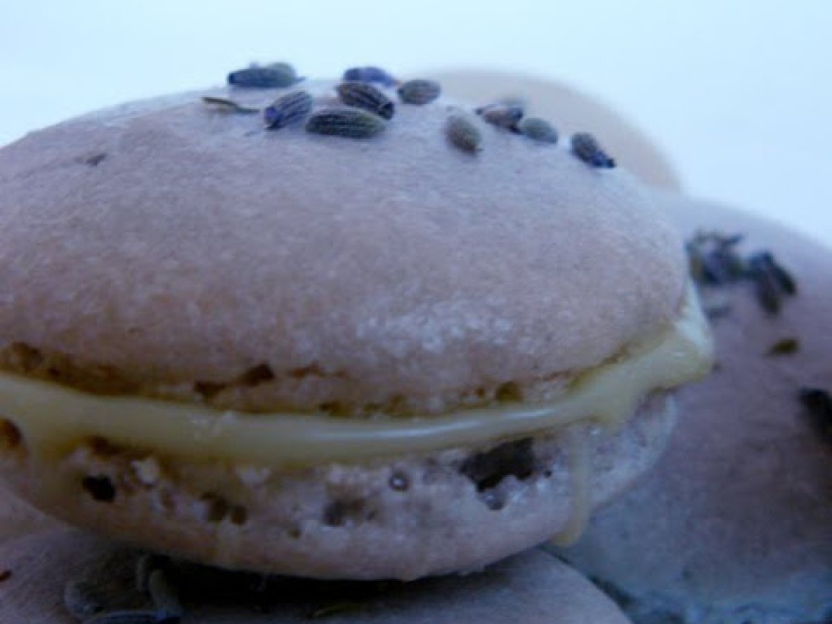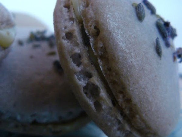 Dejar descansar por lo menos media hora.Precalentar el horno a 160ºC, y cocinar 15 minutos, dando vuelta la placa en la mitad del tiempo.Retirar, dejar reposar un par de minutos y colocar el papel sobre la mesada húmeda para poder despegarlos con más facilidad. - Ganache de chocolate blanco a la lavanda.Lavanda.Picar el chocolate y colocar en un recipiente apto para calor.Hervir la crema con la lavanda. Cuando rompa hervor, colar la crema sobre el chocolate picado, dejar reposar y luego revolver bien para emulsionar.Llevar a frío hasta que tenga consistencia para untar.