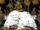 Marzipanstollen (stollen relleno de mazapán). este año para el día de reyes OtroMedio45 min Enviar esta receta a un amigo Imprimir esta página Preguntar al autor Publicar la foto de esta receta Ingredientes 6 Para la primera masa: 750 gr. de harina fuerte 500 gr. de leche 200 gr. de levadura fresca de panadería 30 gr. de mejorante panario Para la segunda masa 1250 gr. de harina fuerte 300 gr. de leche 15 gr. de sal 300 gr. de azúcar 750 gr. de mantequilla 750 gr. de pasas remojadas en ron y bien escurridas 450 gr. de frutas confitadas picadas 400 gr. de almendra laminada ralladura de limón un poco de nuez moscada rallada un poco de clavo molido un poco de vainilla o azúcar avainillado Para elmazapán 500 gr. de almendra molida 380 gr. de azúcar glas 20 gr. de glucosa 100 gr. de agua una gota de esencia de almendras Para finalizar: Mantequilla fundida y azúcar glas