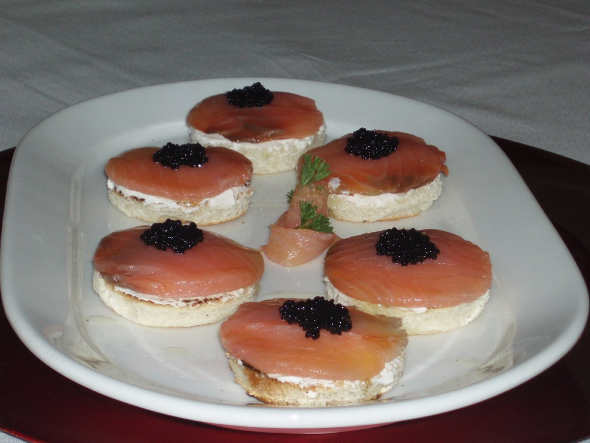 Montaditos de salmón ahumado AnteriorSiguiente OtroMedio25 min Enviar esta receta a un amigo Imprimir esta página Preguntar al autor Publicar la foto de esta receta Ingredientes 8 Pan de molde Queso tipo philaldelphia Salmón ahumado Aceite de oliva Sucedáneo de caviar
