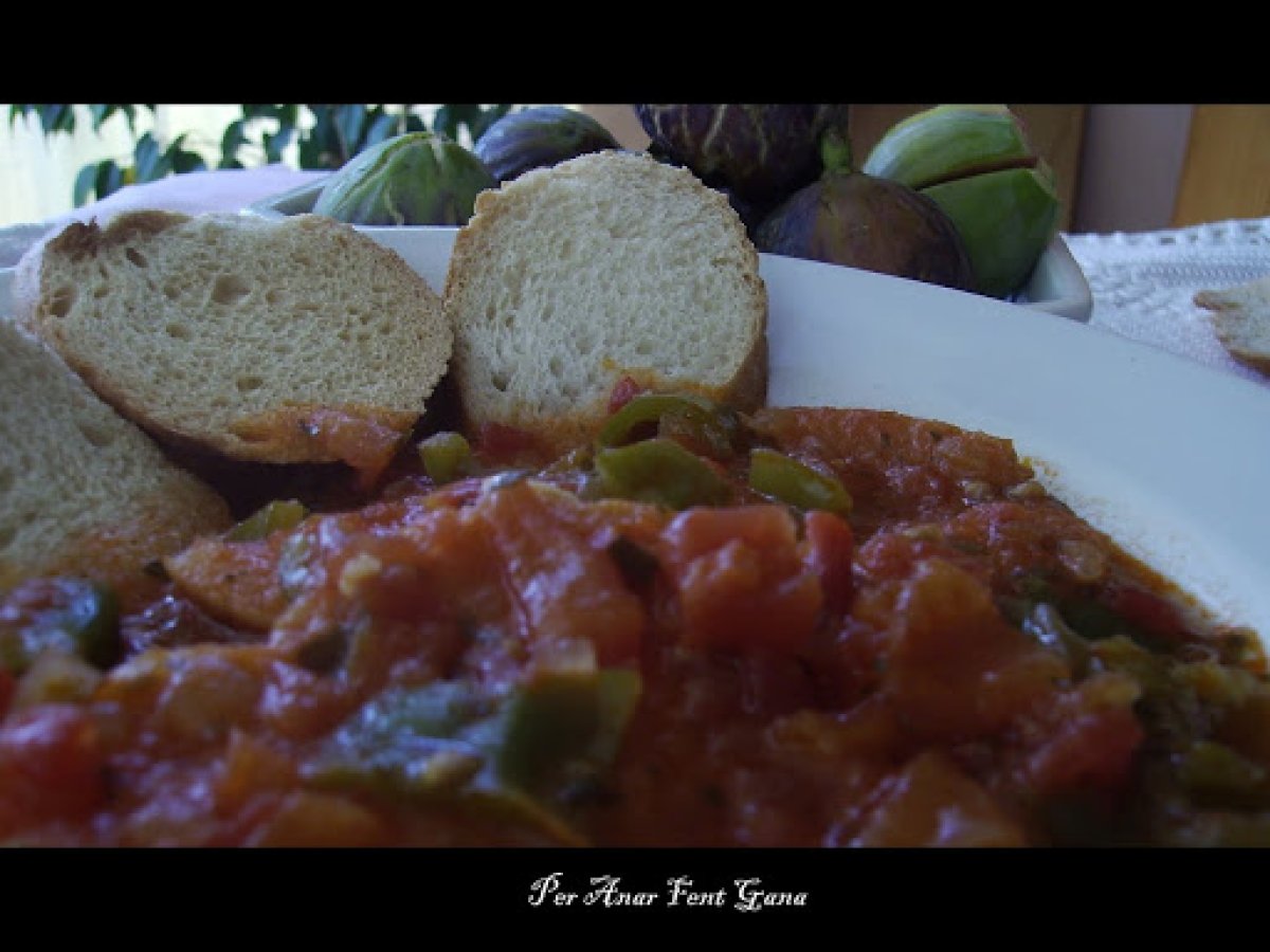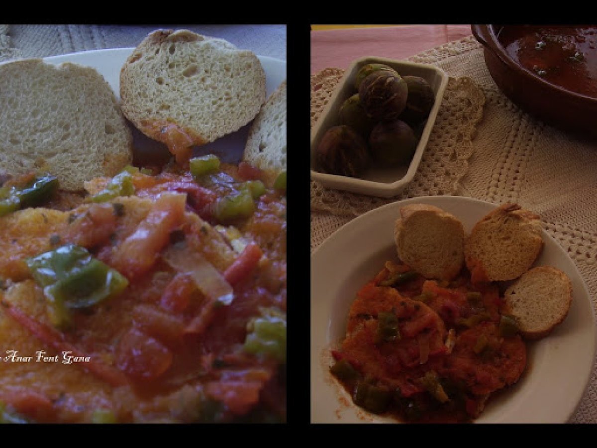 - En una cazuela de barro ir sofriendo la cebolla y el ajo. Incorporar el tomate y el pimiento sin que se queme ir sofriendo poco a poco, Añadimos la sal y un toque de azúcar ( este és el secreto de mi abuela)