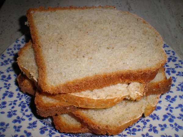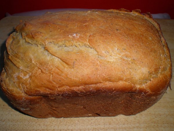Muy rico este pan, la casa entera tenía un olorcito a asado... La receta original se hacía con panecitos pero la masa era demasiado pegajosa como para sacarla de la panificadora. Lo he hecho con harina blanca de fuerza, pero la próxima mezclaré harina integral que lo prefiero al ser más sana, aunque luego voy y me casco unas manitas de cerdo... a ver como te lo explicas... Yo me lo comí con una manitas de cerdo. El resto a rebanadas y al congelador, como siempre.