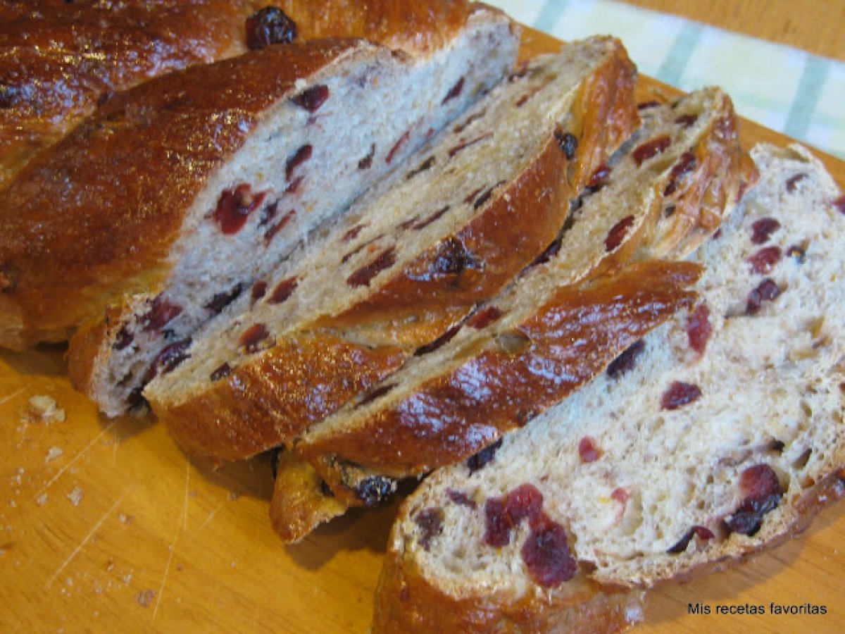 Pan con frutas, nueces y masa madre vota ahora AnteriorSiguiente OtroMedio1 h 15 m537 Kcal Enviar esta receta a un amigo Imprimir esta página Preguntar al autor Publicar la foto de esta receta Ingredientes 8 240 grs harina de fuerza 100 grs. harina integral 80 grs. harina de avena 43 grs. azúcar moscabada 5 grs. sal 220 grs. masa madre 100% hidrat. 1 gr. levadura seca instantánea 20 grs. jugo de naranja fresco 2 cucharadas de piel rallada de naranja 95 grs. huevo ligeramente batido 115 grs. leche líquida a temperatura ambiente 28 grs. de aceite de coco 45 grs. agua tibia 230 grs. de una mezcla de arándanos, cerezas y pasas secos 80 grs. de nueces tostadas picaditas 1 huevo batido para pintar Costo estimado: 5.42Euros€ (0.68€/porción)