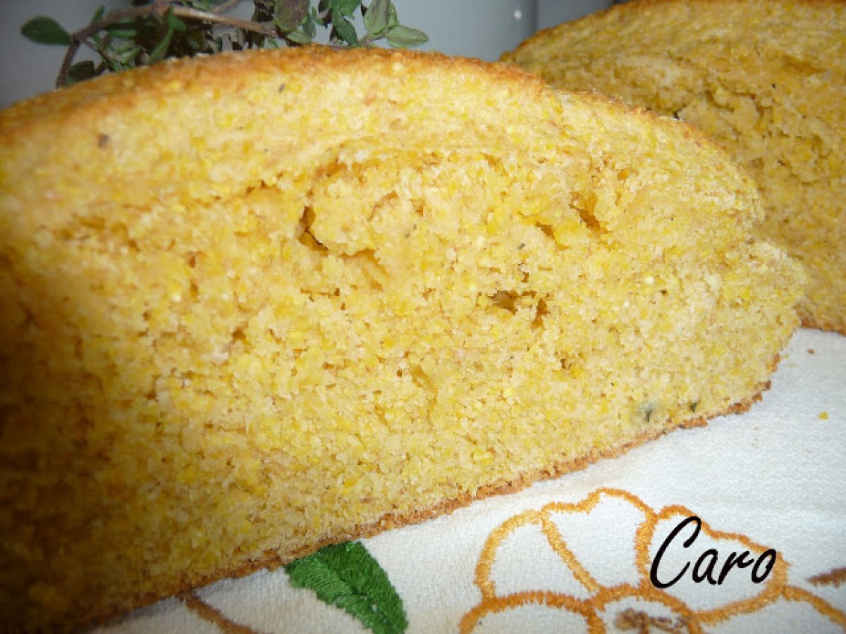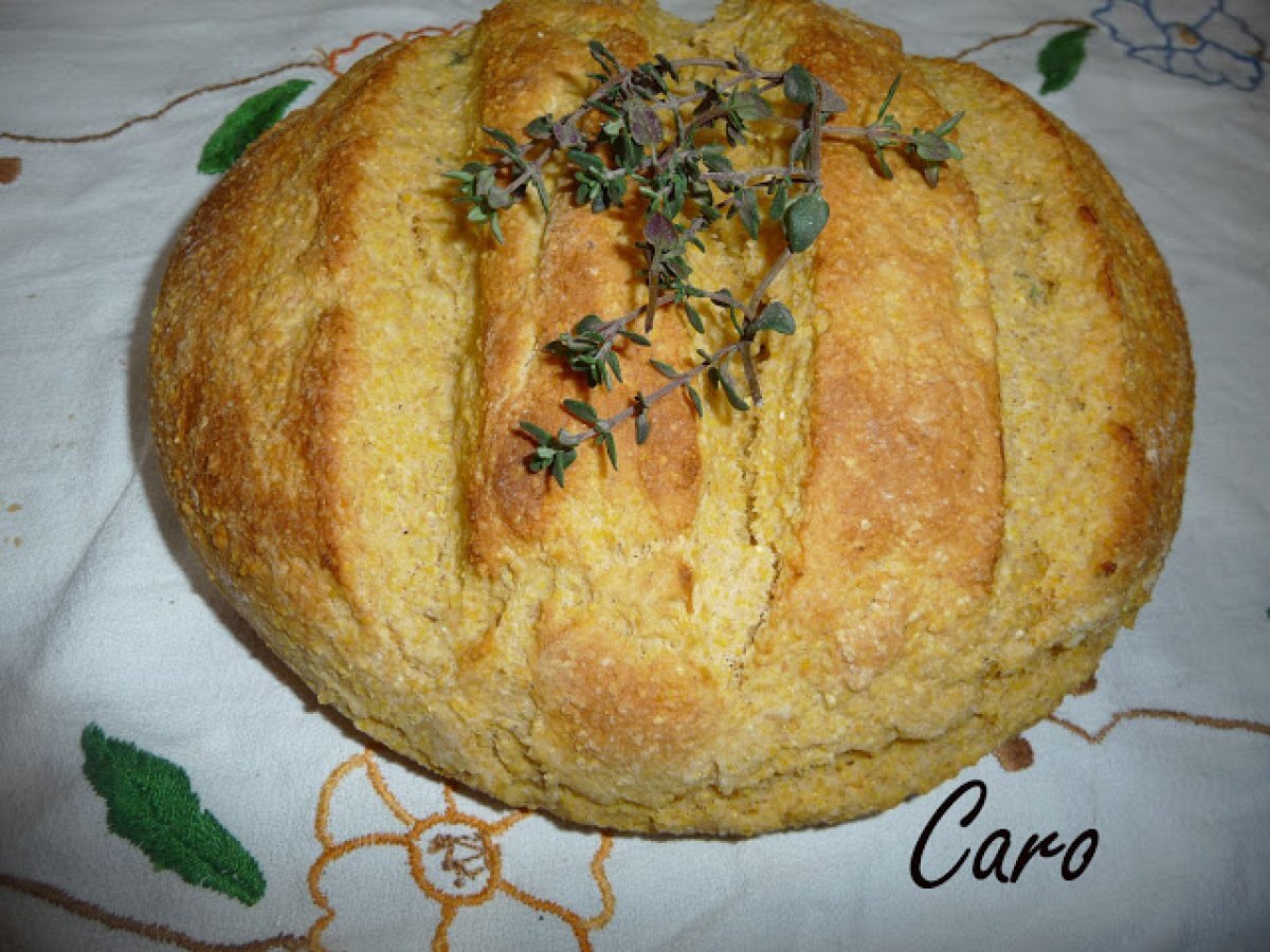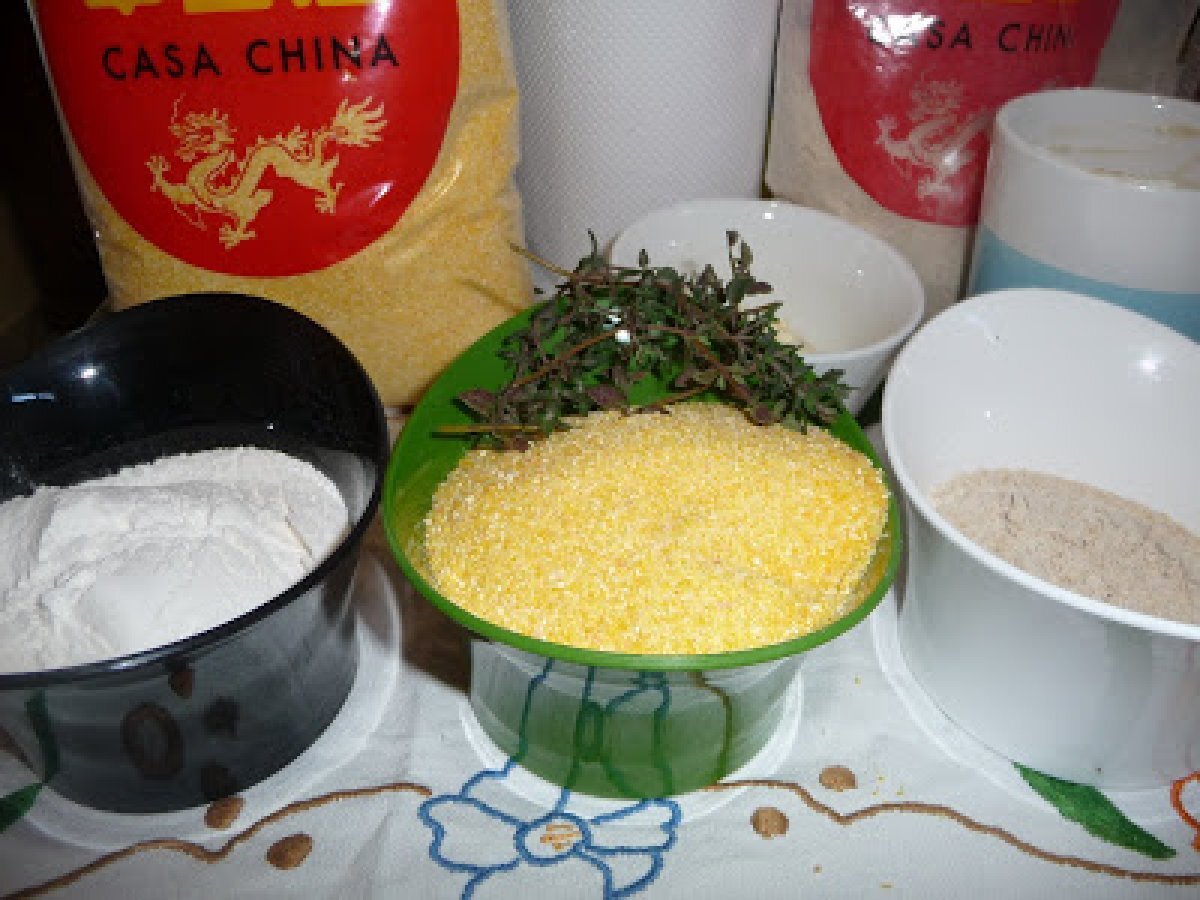 Pan de harina de maíz y tomillo AnteriorSiguiente OtroFácil1 hora2370 Kcal Enviar esta receta a un amigo Imprimir esta página Preguntar al autor Publicar la foto de esta receta Ingredientes 2 2 tazas de harina de maíz 1 taza de harina común de trigo 1 taza de harina integral de trigo 1/2 taza de aceite 25 g de azúcar 2 huevos 50 g de levadura fresca 1 cda. de tomillo fresco agua o leche cantidad necesaria 3/4 de cdita. de sal Costo estimado: 2.1Euros€ (1.05€/porción)