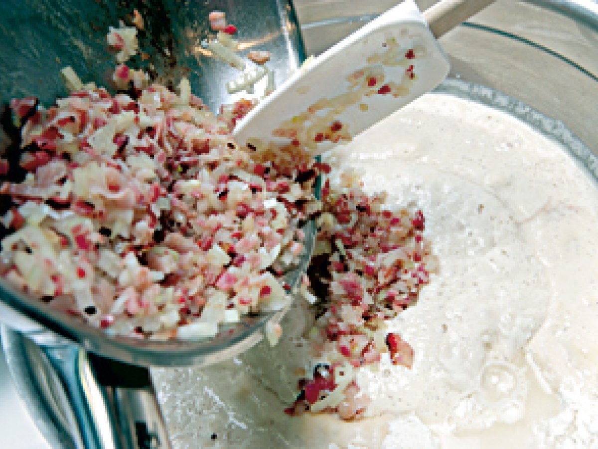Pan de jamón y cebolla AnteriorSiguiente OtroFácil1 h 15 m Enviar esta receta a un amigo Imprimir esta página Preguntar al autor Publicar la foto de esta receta Ingredientes 4 1 kg. de harina de trigo 40 g de levadura Aprox. 1/2 l de agua tibia 1 cucharadita de sal 150 g de jamón de Teruel en taquitos pequeños 20 g de mantequilla 150 g de cebolla