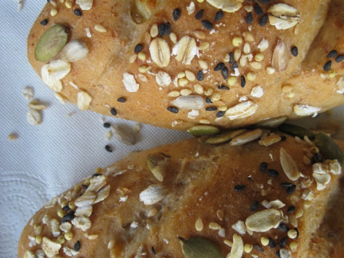 Pan integral con semillas.... y queso! AnteriorSiguiente OtroFácil38 min364 Kcal Enviar esta receta a un amigo Imprimir esta página Preguntar al autor Publicar la foto de esta receta Ingredientes 4 Masa de arranque: 210 grs de harina de fuerza 2 grs levadura seca instantánea 120 grs. agua fría Masa final: 50 grs. harina integral 40 grs. harina diez granos 20 grs. azúcar morena clara 4 grs. sal 2 grs. levadura seca instantánea 80 grs. agua fría 20 grs. mantequilla derretida Decoración y relleno: Una mezcla de semillas y/o granos a su gusto: utilicé sésamo, girasol, calabaza, hojuelas de avena y mijo. Queso mozarella cortado en trocitos. Costo estimado: 0.76Euros€ (0.19€/porción)