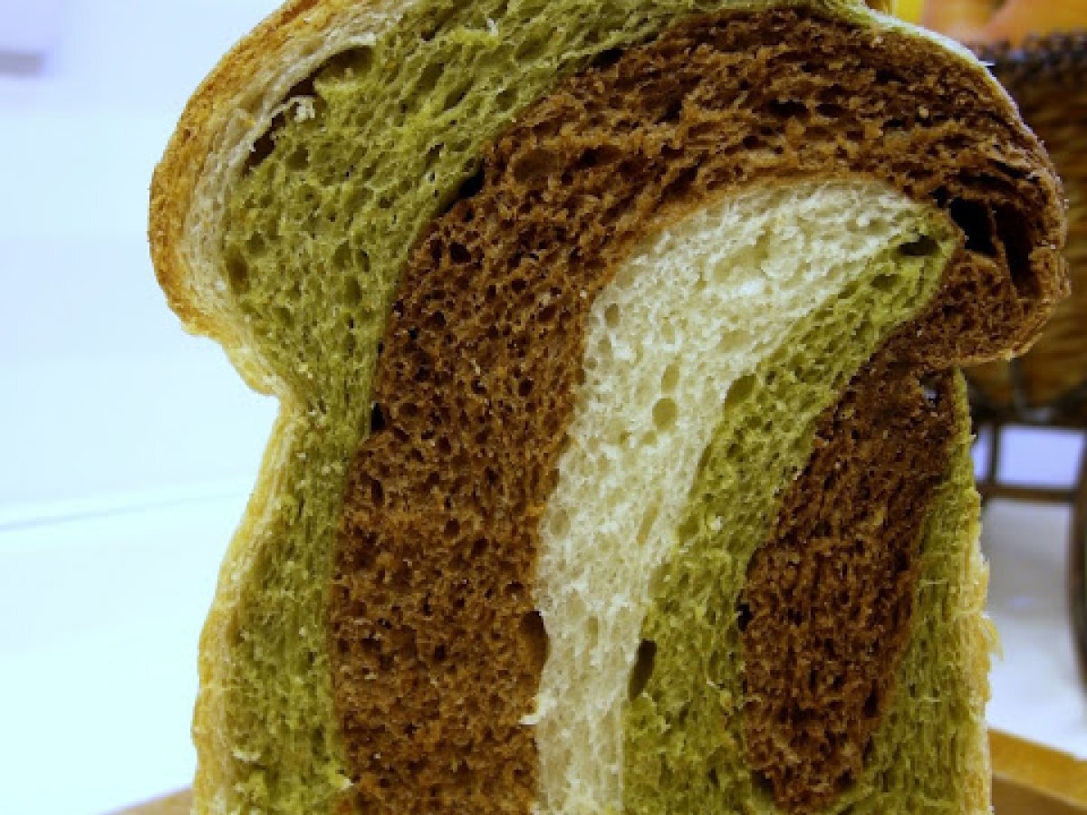 Pan tricolor estilo japonés OtroFácil45 min Enviar esta receta a un amigo Imprimir esta página Preguntar al autor Publicar la foto de esta receta Ingredientes 4 350 g harina de fuerza 6 g levadura seca instantánea 15 g azúcar 6 g sal 20 g sirope de maíz 15 g mantequilla 1/2 huevo 75 g crema o nata de leche 170 g leche 8 g de té matcha 8 g de cacao en polvo 4 cucharaditas de agua