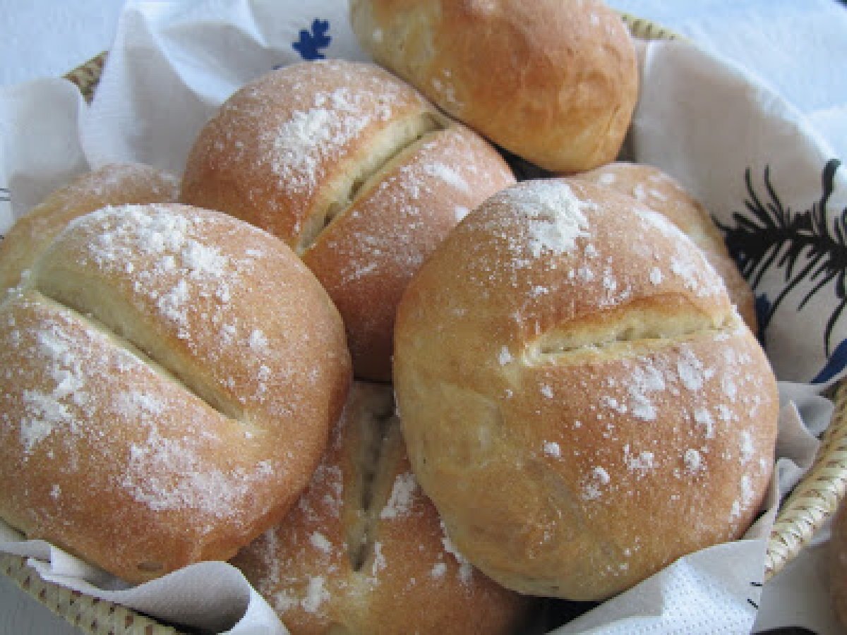 - Tapamos las bandejas con un paño y dejamos levar 45 minutos. Precalentamos el horno a 200ºC, con un recipiente con agua en el interior.Pasado ese tiempo, hacemos un corte en el centro de cada panecillo y espolvoreamos con harina.Horneamos durante 15/20 minutos, hasta que estén dorados. Enfriamos sobre una rejilla.