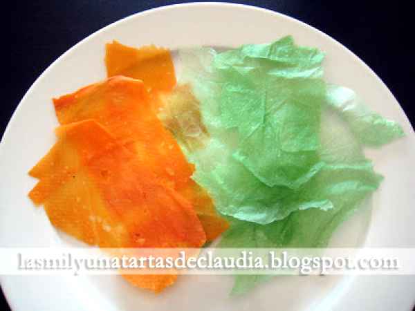 Pañuelos crujientes de verduras OtroMedio3 h 30 m Enviar esta receta a un amigo Imprimir esta página Preguntar al autor Publicar la foto de esta receta Ingredientes 8 Pañuelo de yuca 50 grs. de yuca rallada 150 grs. de agua Una pizca de sal Pañuelo verde de huevas de mujol 25 gr. de almidón de patata 175 ml. de agua Licuado de perejil Polvo de hueva de mujol Pañuelo morado de huevas de corvina 300 gr. de patata morada Polvo de huevas de corvina Agua Sal Pañuelo naranja de boniato y con caballa 300 gr. de boniato Cinco especias Polvo de caballa Sal