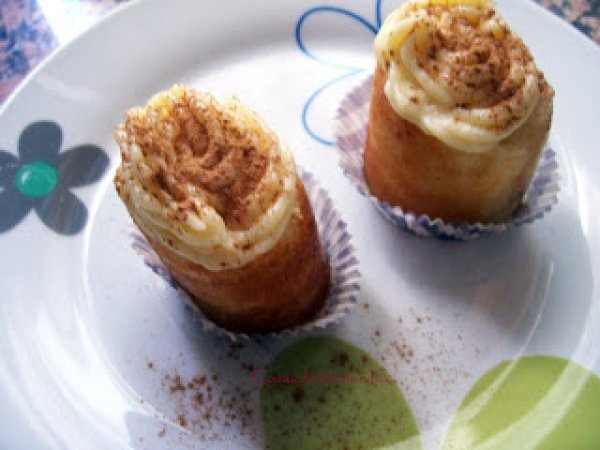 - Corta cada cilindro en rodajas de 4 centímetros. Báñalos en el almíbar. Los colocamos verticalmente, espolvoreamos con canela y le ponemos por encima crema pastelera. La espolvoreamos con azúcar y la quemamos (con la ayuda de un soplete) para caramelizarla, colóquelos en cápsulas de papel y sírvalos muy fríos.