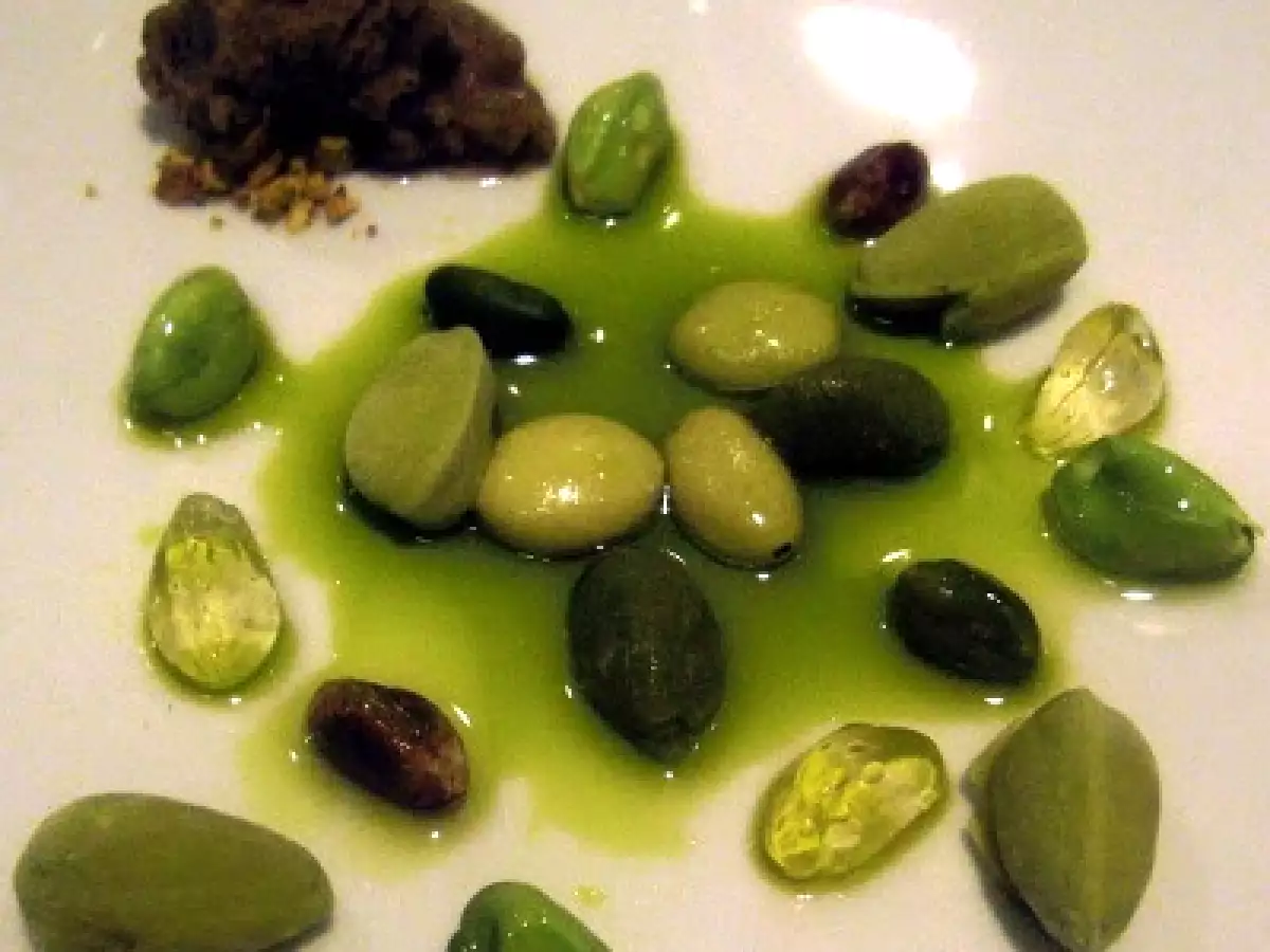 Pistachos en seis texturas (ferran adriá) OtroMedio50 min Enviar esta receta a un amigo Imprimir esta página Preguntar al autor Publicar la foto de esta receta Ingredientes 4 Para la leche de pistacho verde : 500 g de agua mineral 250 g de pistacho verde pelado 7 g de sal Para la crema de leche de pistacho verde : Leche de pistacho verde Para el molde de pistacho cáscara de crema de pistacho verde : Crema de pistacho verde Para el baño de Algin 500 g de agua 25 g de ALGIN Para los esféricos molde de pistachos crudos : 200 g de crema de pistacho verde 6 g gluco molde de pistachos crudos Aceite de pistacho verdeBaño de Algin Para el praliné de pistacho : 500 g de pistacho verde pelado 200 g aceite de pistacho verde 7 g de sal Para el molde de pistacho crudo de crema de praliné de pistacho : 200 g praliné de pistacho Para el agua de coco lápiz : 1 Coco lápiz (300 g de leche) Para la gelee de coco lápiz : 100 g agua de coco lápiz 3 g de agar agar 2 h de gelatina cola de pescado Para el molde de pistacho crudo gelee de coco lápiz : gelee de coco lápiz Para el helado de trufa : 180 g de jugo de trufa 5 g de estabilizante 18 g de aceite de trufa 8 g de trufa picada 2 huevos 3 g de xantana 2 g de sal 1 gota sorbitol Para los pistachos tostados : 12 pistachos Para los pistachos tiernos repelados : 16 pistachos tiernos Para el aceite ahumado : 100 g de aceite de girasol