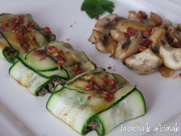 Raviolis de calabacín rellenos de carne y foie AnteriorSiguiente OtroMedio1 h 40 m712 Kcal Enviar esta receta a un amigo Imprimir esta página Preguntar al autor Publicar la foto de esta receta Ingredientes 4 * 250 gr. de champiñones. * 200 gr de carne picada. * 1/2 cebolla. * 2 dientes de ajo. * 40 gr de jamón ibérico. * 2 calabacines. * Foie mi cuit. * Aceite de oliva virgen extra (AOVE) * Sal. Costo estimado: 26.3Euros€ (6.57€/porción)