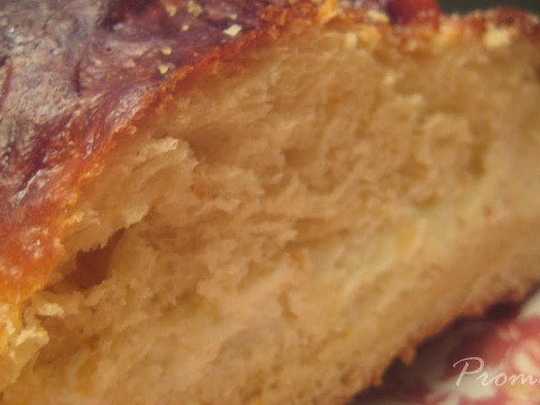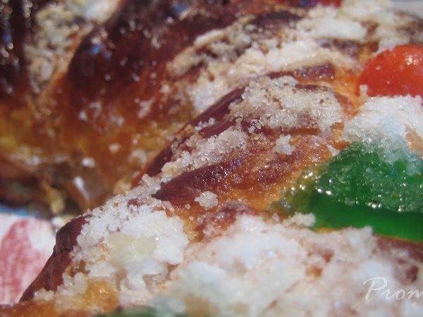 - Con la bola de masa ya relajada en la bandeja del horno metemos las manos en el centro de la bola y vamos estirando desde el centro hacia los lados para formar el roscón del tamaño de la bandeja del horno, tenemos que ir diciendo a la masa que queremos que suba hacia arriba y no se extienda hacia los lados así que iremos remetiendo la masa desde el centro y desde el exterior hacia dentro del roscón. Con la mano izquierda en el hueco del roscón y la derecha en la parte de fuera, vamos remetiendo hacía dentro y dando forma a la vez. Es un poco difícil de explicar. Si la masa tiende a ?cerrarse? hacía el centro o a encogerse, es que no está bien relajada, dejarla reposar otros diez minutos y se manejará mejor. Una vez formado el roscón, pintamos con huevo batido y tapamos con un film o plástico engrasado para que leve por tercera vez. Tercer levado : Tardará en doblar una hora mas o menos. Antes de que termine el tercer levado, precalentar el horno a 200º y poner en la base del horno un recipiente pequeño apto para horno lleno de agua. Una vez terminado el tercer levado, volver a pintar con huevo batido (delicadamente para que no se baje) y adornar al gusto con frutas, almendras y azúcar remojado en agua. Poner en el horno, en la segunda ranura empezando por abajo, e inmediatamente bajar la temperatura a 180º. En media hora está hecho. Hay que tener cuidado porque a los 15 min. vi. que se estaba dorando demasiado y lo dejé 5 minutos más, para la próxima vez, si me vuelve a pasar, lo cubriré con papel de aluminio cuando vea que se puede dorar demasiado ó bajare la temperatura del horno un poco. Pasado el horneado, sacar con mucho cuidado y colocarlo sobre las rejillas, cuando enfríe cortarlo por el centro de forma horizontal con un cuchillo de hoja fina y rellenar con lo que más nos guste (nata, crema pastelera, moca), también se puede dejar tal cual, porque el sabor es tan especial y la textura tan esponjosa que no necesita de más. Para muestra un botón: Por mi tierra, no se por las demás hay la costumbre de insertar en la masa o escondidas entre el relleno figuras que soporten el calor, evidentemente, y una haba seca envuelta en papel film ó de aluminio. El que encuentra el rey se coloca la corona con la que se suele adornar y el que se tropieza con la haba, además de ser motivo de burla y risas paga el roscón.