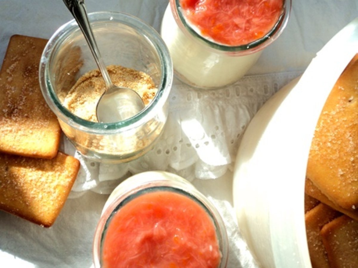 Ruibarbo con crema de coco AnteriorSiguiente OtroFácil45 min563 Kcal Enviar esta receta a un amigo Imprimir esta página Preguntar al autor Publicar la foto de esta receta Ingredientes 4 20 galletas Napolitanas 300 g de ruibarbo cortado en trozos muy pequeños 100 g de azúcar 6 cucharadas soperas de agua ralladura de una naranja 3 huevos 90 g de azúcar una lata de leche de coco 60 ml de crema de leche 1 pellizco de sal 25 g de maizena Costo estimado: 4.49Euros€ (1.12€/porción)