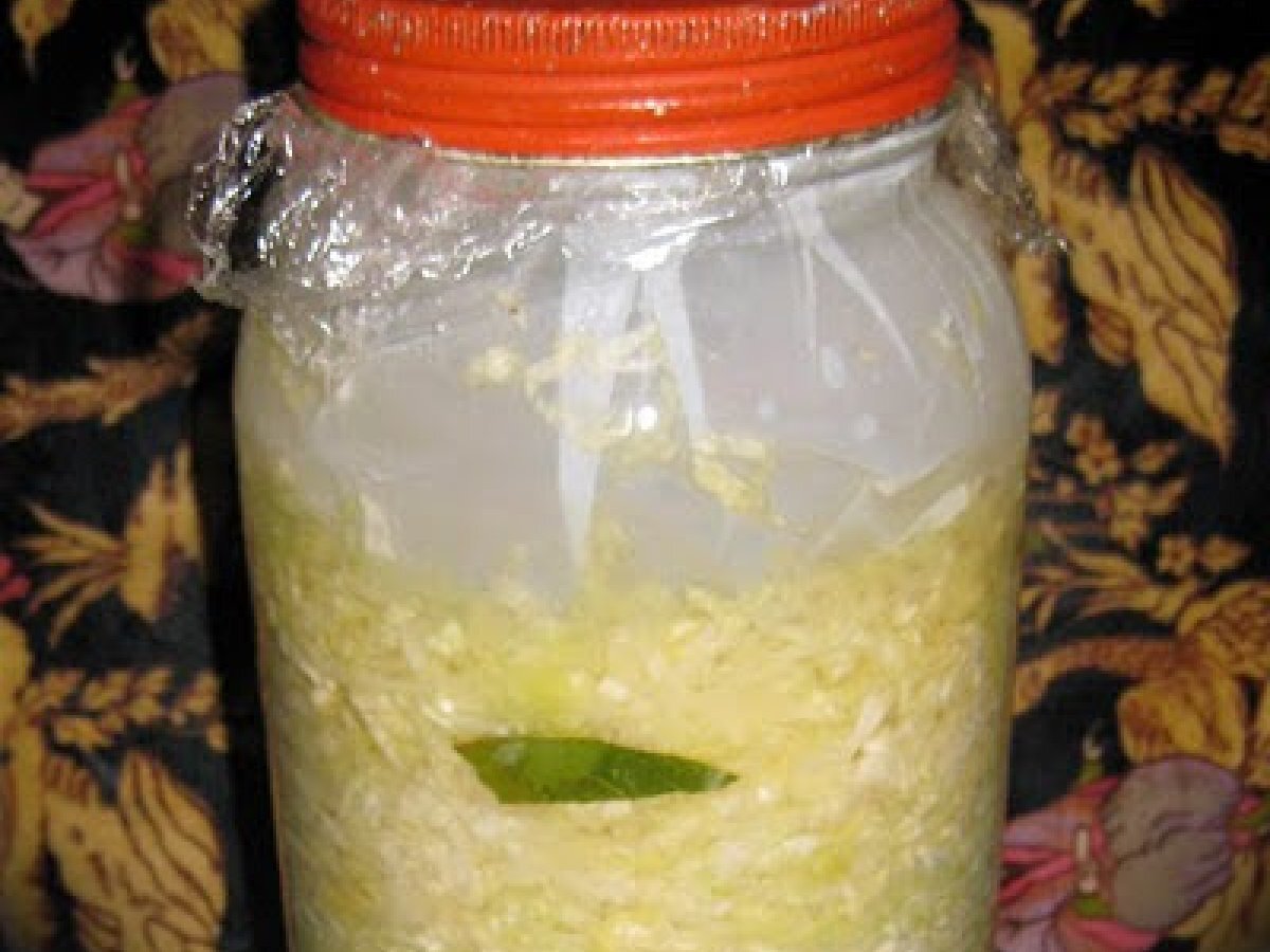 - Encaje el fardo salmueroso en el bote, de manera que cubra la superficie del líquido de los repollos y evite cualquier contacto de de éstos con el aire.