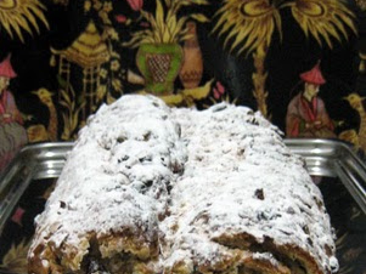 Stollen vegano total gern OtroMedio55 min Enviar esta receta a un amigo Imprimir esta página Preguntar al autor Publicar la foto de esta receta Ingredientes 5 500 g harina blanca o *mitad de blanca y mitad de integral si son modernos 220 g de materia grasa que constan 185 g margarina vegetal 33 g de aceite de almendras (o algo parecido) 100 g azúcar 235 g pasas sultanas y de corinto 115 g almendras 115 g Zitronat Zitronat : 80 cl leche de soja 37 g levadura fresca de panadería Algo de ron Cáscaras de limón Una pizca de sal Azúcar lustre/glacé/glas/impalpable Cardamomo: en polvo, evidentemente Mazapán o parsipán Nueces Semillas de amapola