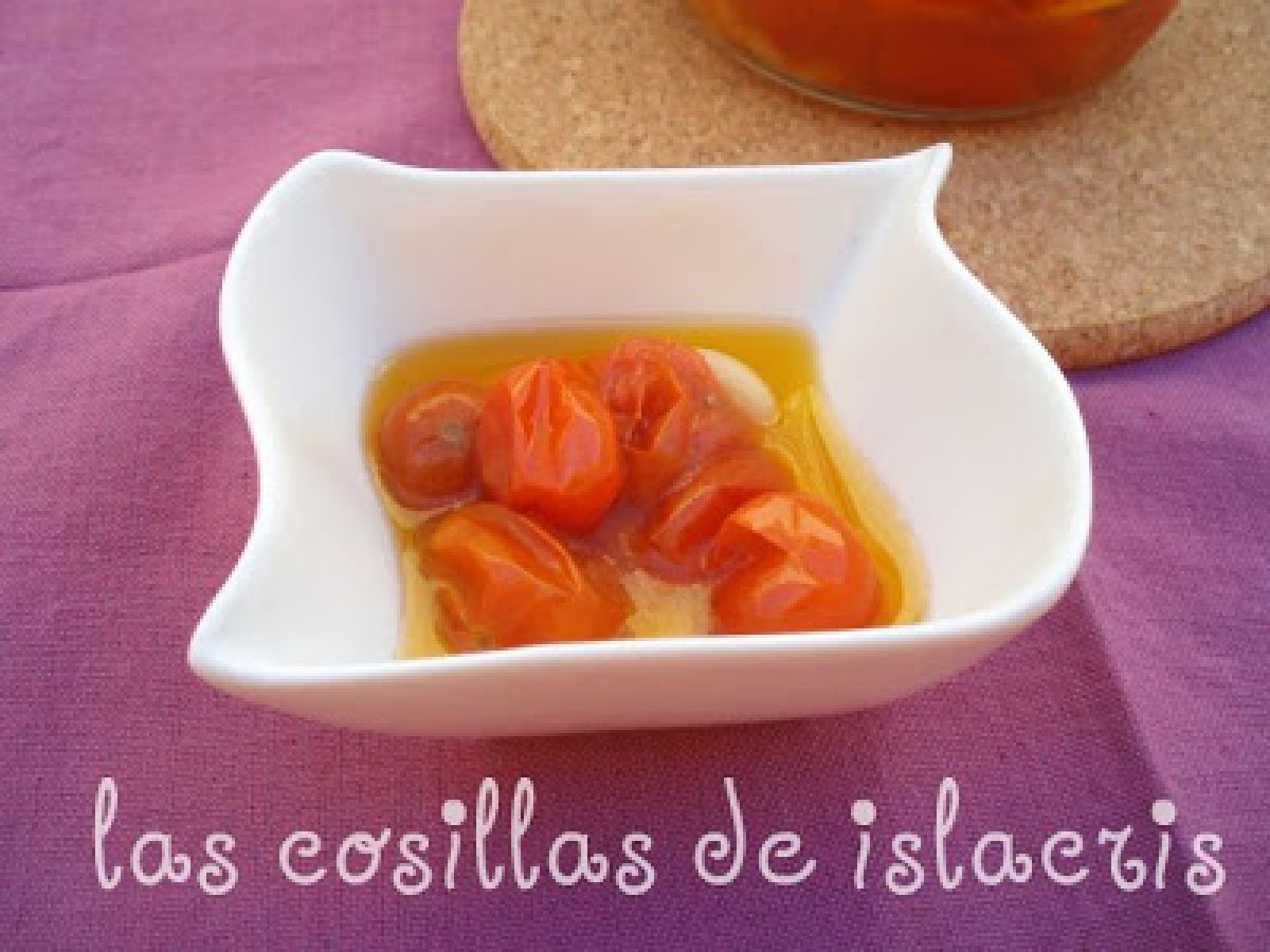 Tomates cherry confitados OtroFácil25 min117 Kcal Enviar esta receta a un amigo Imprimir esta página Preguntar al autor Publicar la foto de esta receta Ingredientes 3 500 g tomates cherry 1 cabeza de ajo pelados 1 guindilla cayena Comino 1 cuharadita de azúcar moreno Sal Aceite de oliva virgen Laurel Costo estimado: 5.15Euros€ (1.72€/porción)