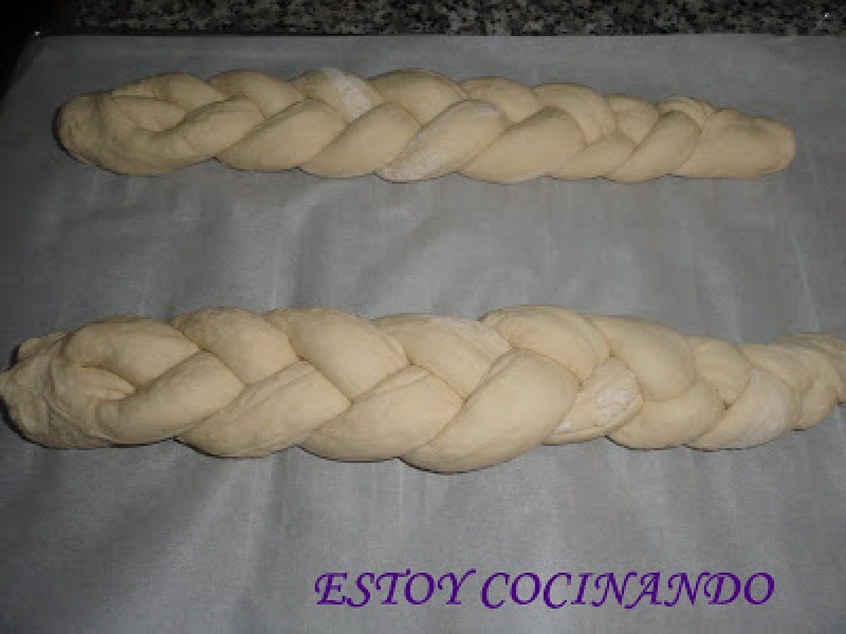 - Tras el tiempo de reposo la masa habrá doblado su volumen es entonces cuando la dividimos en tres porciones y le damos la forma de trenza. La colocamos en la bandeja del horno y la dejamos de nuevo reposar otra hora.
