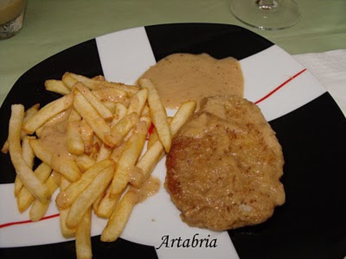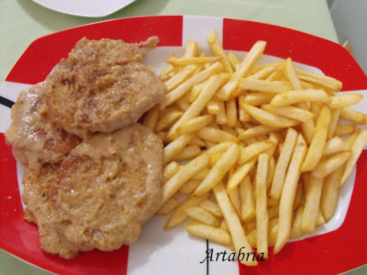 17.- lomo de cerdo con salsa de almendras AnteriorSiguiente PlatoFácil35 min1088 Kcal Enviar esta receta a un amigo Imprimir esta página Preguntar al autor Publicar la foto de esta receta Ingredientes 1 Filetes de lomo de cerdo 1/2 cebolla 1 pastilla de caldo concentrado 2 galletas María 1/2 vaso de vino blanco 1 puñado de almendras tostadas 1 diente de ajo 2 rebanadas de pan duro 2 huevos Pan rallado Aceite Sal Costo estimado: 2.24Euros€ (2.24€/porción)