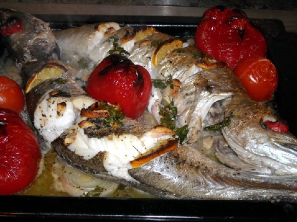 - Pica ajo y perejil y lo echas por encima, así como al tarro de las 5 pimientas le das un par de vueltas. Pones al lado del pescado los pimientos y los tomates. Un chorro de vinagre y luego otro buen chorro de aceite de oliva por encima.