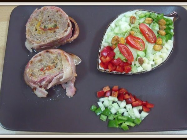 Albondigón relleno de rajas con ensalada de maíz frito vota ahora PlatoFácil40 min Enviar esta receta a un amigo Imprimir esta página Preguntar al autor Publicar la foto de esta receta Ingredientes 1 Para el albondigó 1 1/2 kg de carne de vacuno 1/2 kg de carne de cerdo 1/4 kg de lonchas de tocino o bacon 200 g de pimiento morrón 1/4 de cebolla 3 chiles poblanos asados 1 panecillo en rodajas y remojado en leche 1 diente de ajo 3 huevos 1 cucharadita de orégano seco 1 cucharadita de comino en polvo 3 clavos de olor 1/2 cucharadita de pimienta negra 1 cucharada de pan rallado Sal Para la ensalada de maíz 1 cebolla mediana, cortada y separada por anillas 1 pimiento verde cortado en dados 1 pimiento rojo cortado en dados 1 pepino pelado y troceado 1 lechuga troceada en juliana 1 tomate cortado en dados 150 g. de queso Cheddar en dados 1 paquete pequeño de maiz frito (kikos) Aceite de oliva extra virgen Sal y vinagre 1/2 cucharadita de comino en polvo 1/2 cucharadita de orégano seco 1/2 cucharadita de cilantro